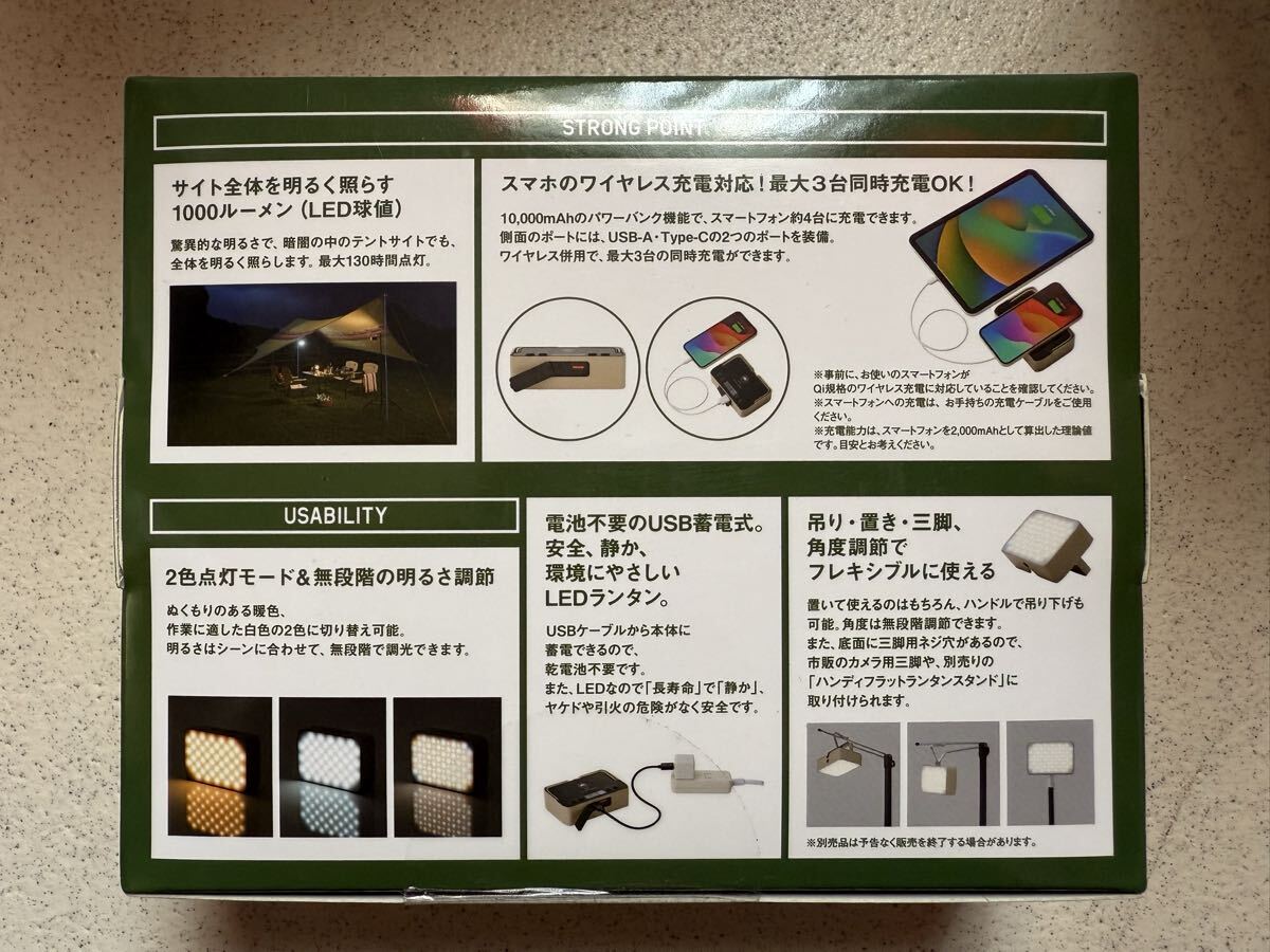 主素材:亜鉛合金、アクリル、PC 性能/特長: ・置くだけスマホ充電機能付き!サイト全体を明るく照らす超高輝度ランタン。 ・ワイヤレス充電・USB・Type-Cに対応する10000mAhパワーのランタン ・スマートフォンなどにも充電できるパワーバンク機能付き ・置くだけ充電!ワイヤレス充電機能付き ・三脚ネジが付いているので、卓上全体を明るく照らせる ・点灯時間最大130時間 ・サイト全体を明るく照らす1000ルーメン ・優しく温もりのある暖色、作業がしやすい白色どちらにも点灯切り替え可能 ・生活防水対応 ・防災推奨品