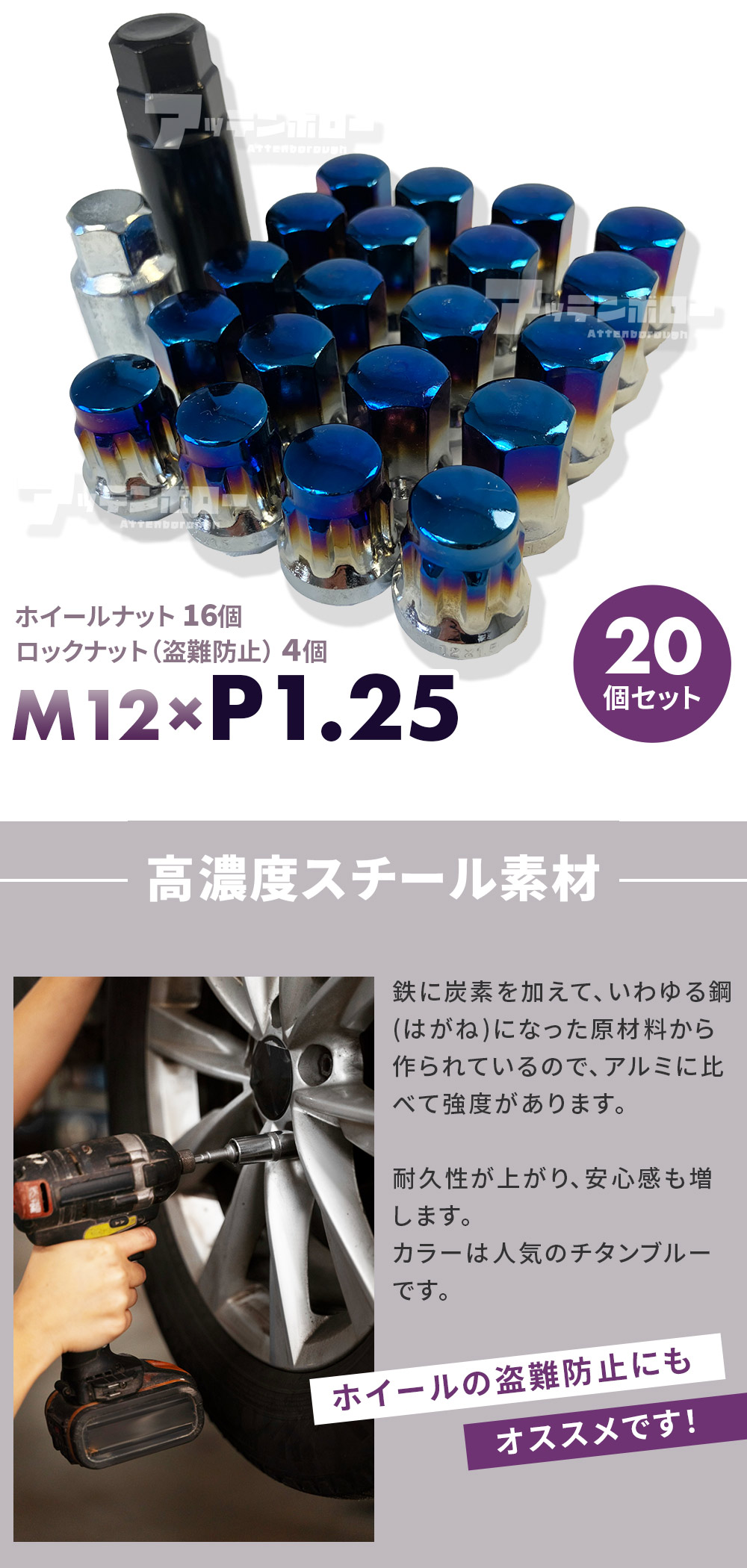 ホイールナット M12 × P1.25 (16個) ロックナット (4個) チタンブルー 外径 21mm 日産 スバル スズキ 工具 收藏