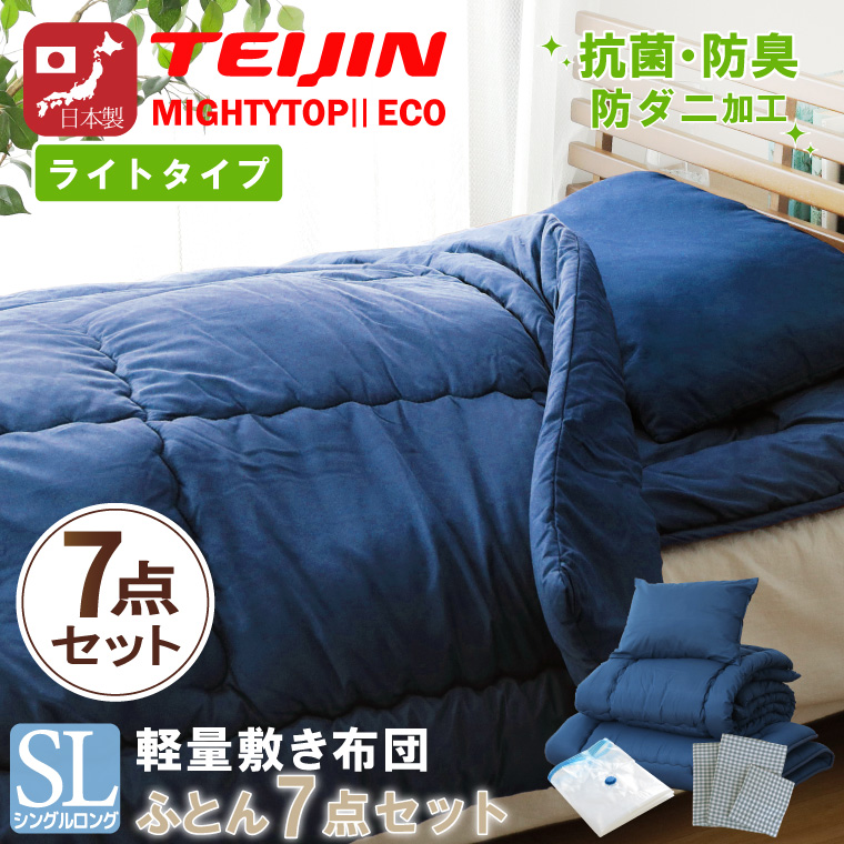 ・抗菌・防臭・防ダニわたを使用したこだわりたっぷりのシングルロングサイズ国産布団セット(掛け・敷き・枕)です。収納用の圧縮袋付きです。ピーチスキン生地使用で肌触りがとってもなめらか。 ・テイジン製の抗菌・防臭・防ダニわた「マイティトップII ECO」を使用。様々な試験で安全性も確認されており、エコ素材を使うことで環境にも配慮。生地の裏側には不織布も一緒に縫い合わせているため、中からわたが吹き出しにくく、とても快適にご使用いただけます。 ・注文をいただいてから国内工場で生産しているので、出来立ての布団をお届け。ご希望でサイズの変更を承ることもできます(別途費用がかかります) ・発送の際、圧縮してお届けしております。再利用できる圧縮袋を使用しているので、使わない際はコンパクトに収納も可能です。 ・創業65年続く国内の布団工場にて熟練の職人がひとつひとつ丁寧に手作り。国内メーカーの検針機にて2回の検針、2回の検品を行っているので、安心してご使用いただけます。この機会に是非お試しください! | |