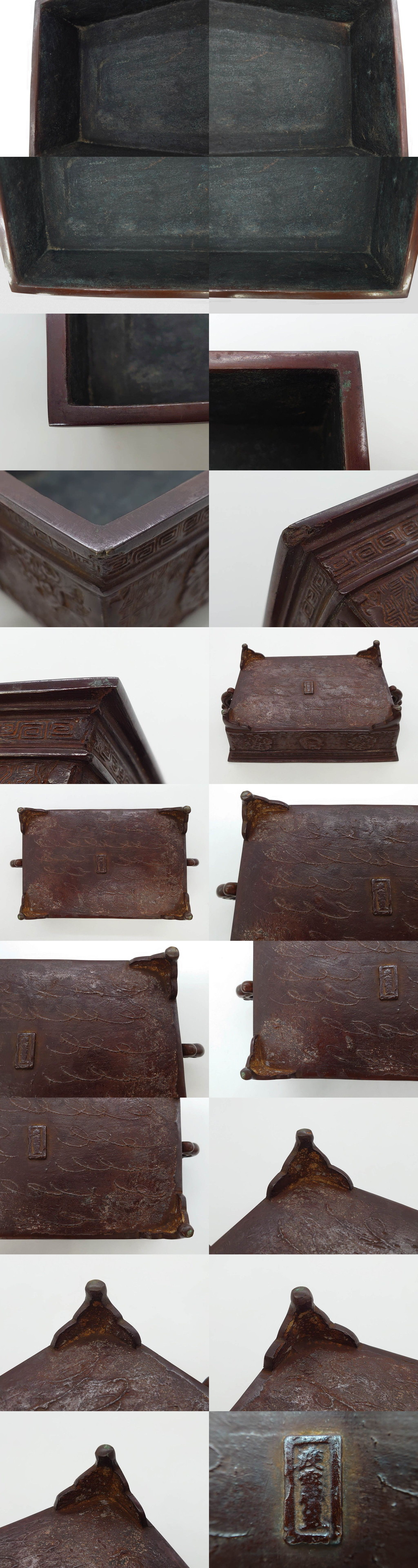 R-083079 木村渡雲(二代 村田整珉) 銅製 雲龍文? 匠の美技を感じる長方水盤(双耳、花器、花入、花生、盆栽鉢、雷文、水鉢、水盆) 收藏