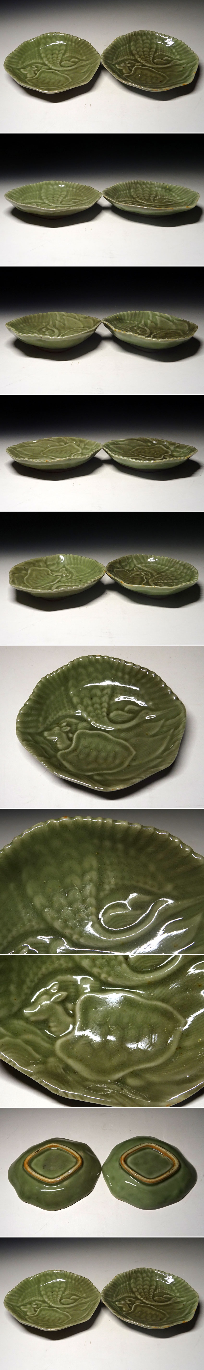 緑屋c■ 時代物 青磁 鶴亀 陽刻 皿 2枚 鍋島青磁 三田青磁 古陶磁 i9/7-7303/4-2#60 收藏