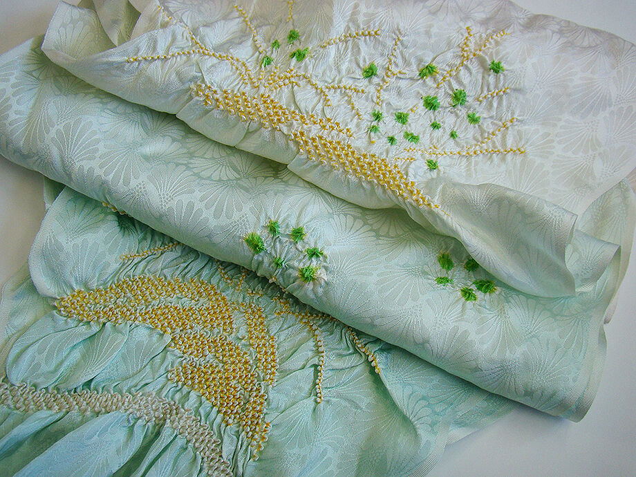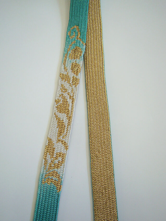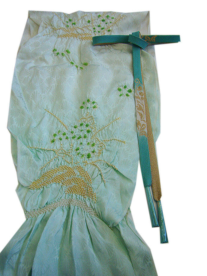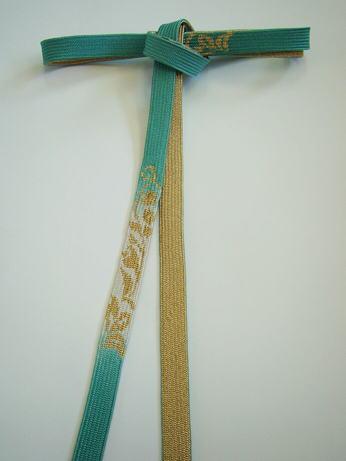 ●帯揚げ: 正絹。 しなやかなさらりとした滑らかなちりめん地、 淡い青竹色、アイボリー色ぼかしに地模様入りに緑、黄色の絞り入り。 ●帯〆: 正絹。 平組。 青緑色地に白色ぼかしに金糸入りの編み込みの組紐。 長さ160cm 幅1.7cm |
