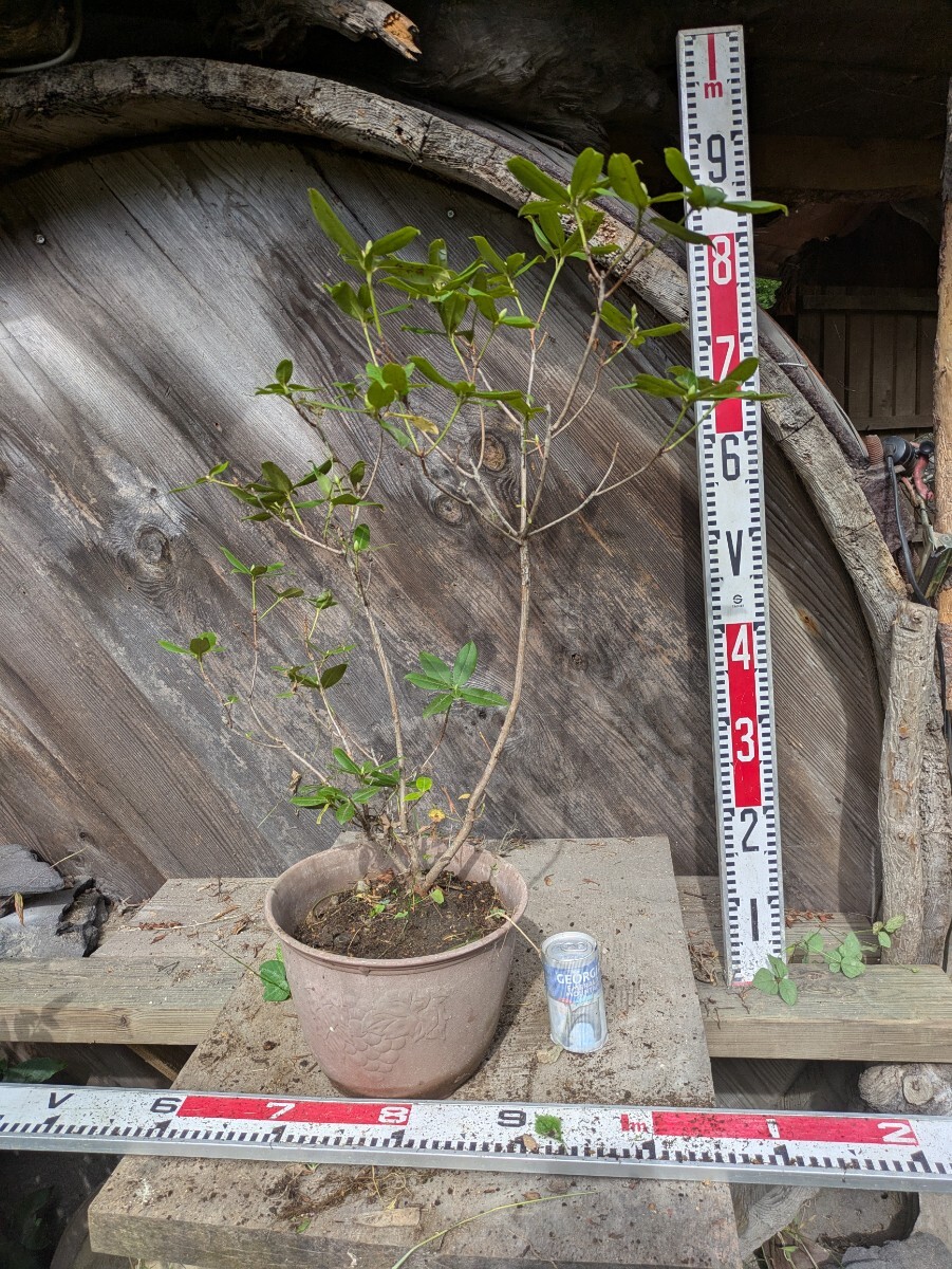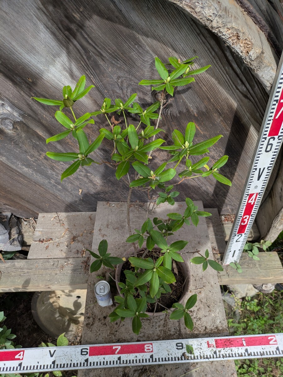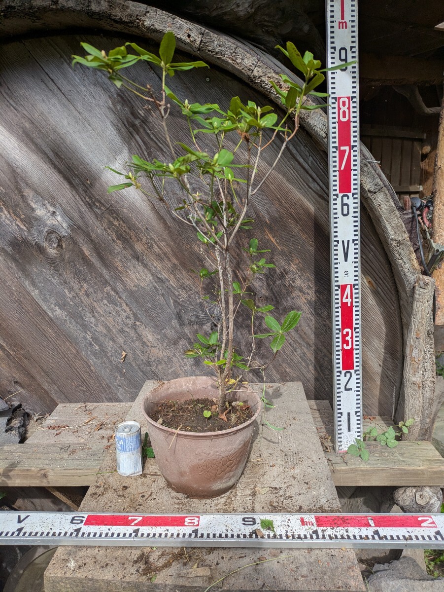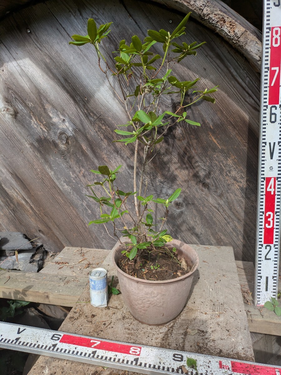 およそは35x35x75cmの枠に入るサイズ。根本付近からの高さは60cmくらい。10年くらいプラ鉢に植えます。日向置き。来春の花芽は沢山付いてます。発送梱包の際に痛むヶ所が有るかもしれません。佐川急便にて発送する事も有ります。