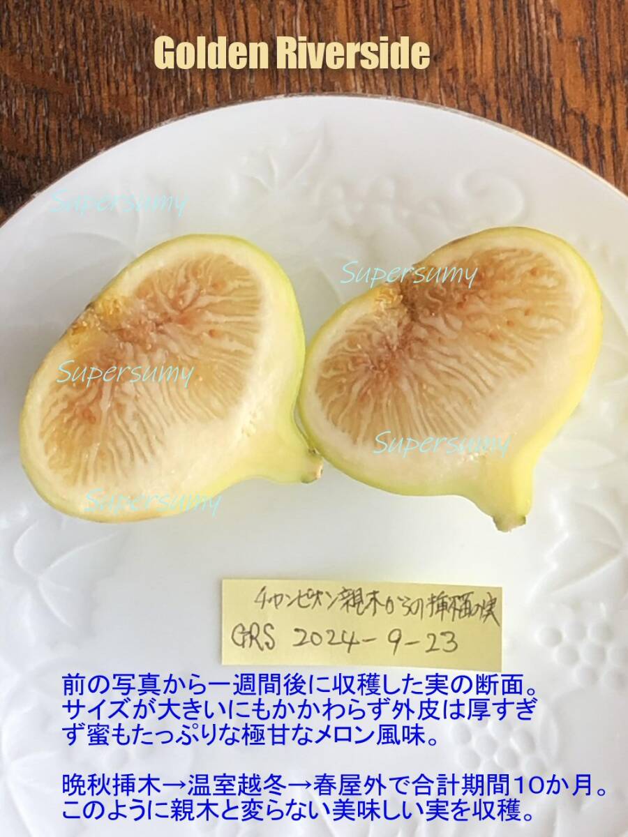 掲載写真中にコメントを入れましたので、それも見ながらお読みいただくとわかりやすいと思います。結論から言うと外皮黄色中大果系の頂点品種と思います。もしかするとその下の品種群、小粒のシュガー系、ハニー系もこれがあれば不要となるかもしれません。一般に中大果品種は中が空洞のものが多いのですが、これは写真のように内部も果肉でつまっており、同系統の品種の中では一番緻密だと思います。中大果系品種は実の内部が空洞化しやすいだけでなく、外皮と果肉のあいだ、柑橘で言うと綿の部分が分厚く、薄味の瓜を食べているような、どこか水っぽくうすら甘い品種が多いのですが、この品種は違います。大きくても甘く皮ごと食べられる高級メロンに近い味だと(個人的には)思います。それと大粒は着果したすべてが均質に収穫できるかというと、そうではなく結構ばらつきますが、この品種は着果した実のほとんどが、変形果も少なく、最後の実まで甘く美味しく食べられます。それと工夫して育成すれば、挿木後10か月で、成木と同様の美味しいイチジクが収穫でる豊産品種です。掲載写真のとおり、これは伝聞や願望ではなく、実際に私が育成し確認した事実です。