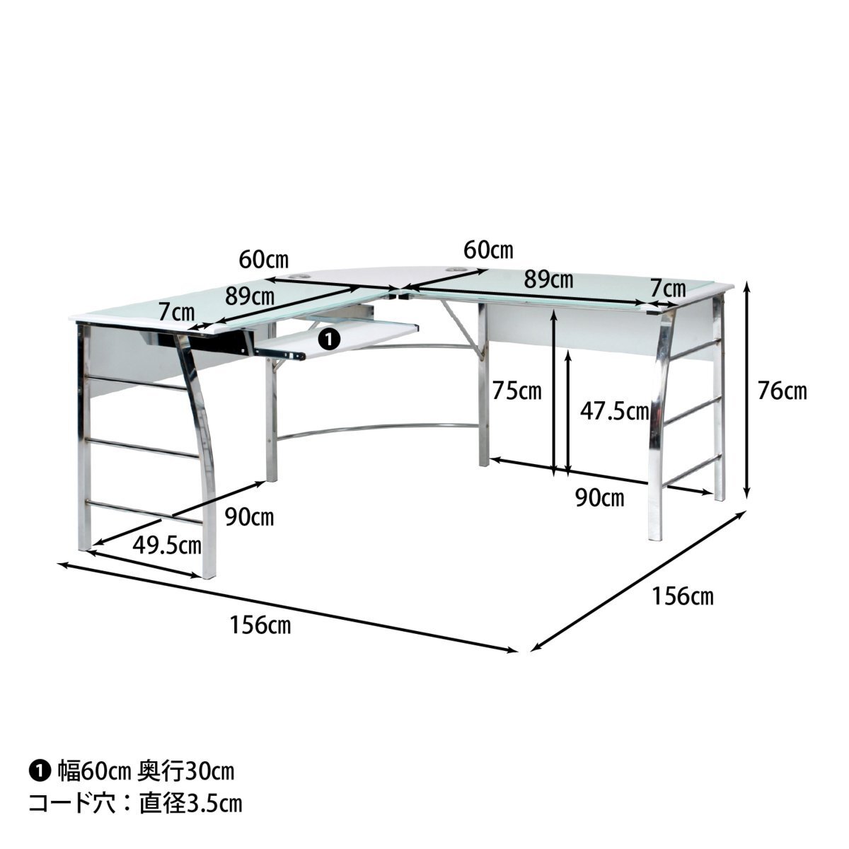 | サイズ | 本体:幅156×奥行156×高さ76cm 天板サイズ(ガラス):890x600x8mm 天板サイズ(コーナー):600x600x15mm キーボード天板:幅60×奥行30cm キーボード天板までの高さ:64.7cm 天板厚:1.5mm(MDF)/8mm(強化ガラス) 本体重量約40㎏ |