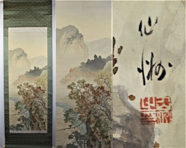 《真作》★望月 仙洲【秋景山水図】(仮題)*古い掛軸.尺八幅.桐箱入*師 畑仙 齢・霊峰*明治~昭和活躍*紅葉*細密画.経年感*物故*[桃] 收藏