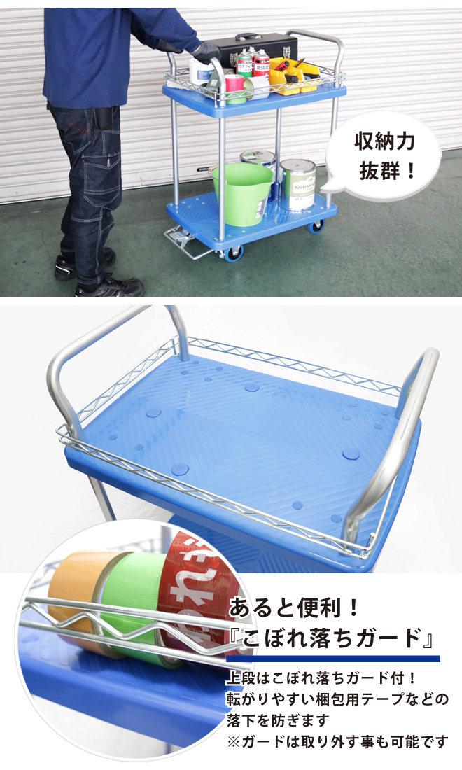 ●2段式でスペースを有効に使え作業効率がUPします ●上段にはこぼれ落ちガードが付いているので、大事な物の脱落を防ぎます (ガードを取り外す事もできます) ●荷台表面はギザギザの滑り止め加工を施し、滑り止めのゴムが4か所付いています ●底面は樹脂製により水や錆に強く強度があります ●駐車ブレーキ付きなので、少し傾斜のある場所でもブレーキをかけて安心して置いておくことができます ●この商品はお客様組立てとなります ※本体の組立てやキャスターの取付けに工具が必要となります ※入荷時期により仕様が異なる場合がございます。ご使用に問題がない返品は承れません。 ★ 取扱説明書はこちら |