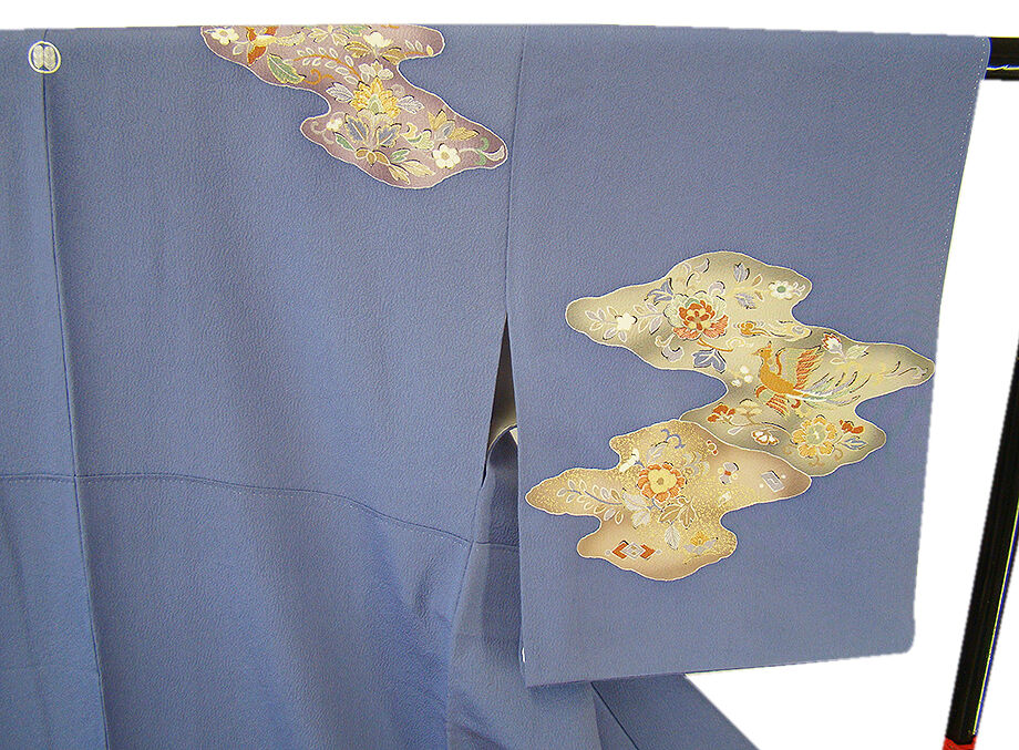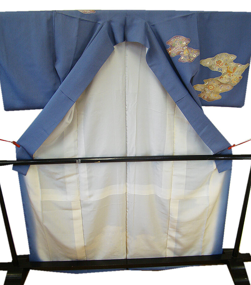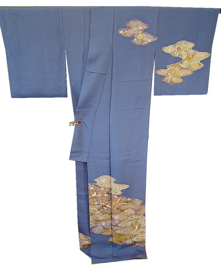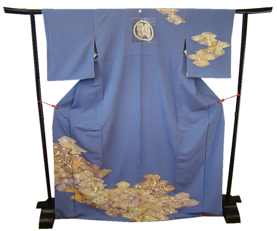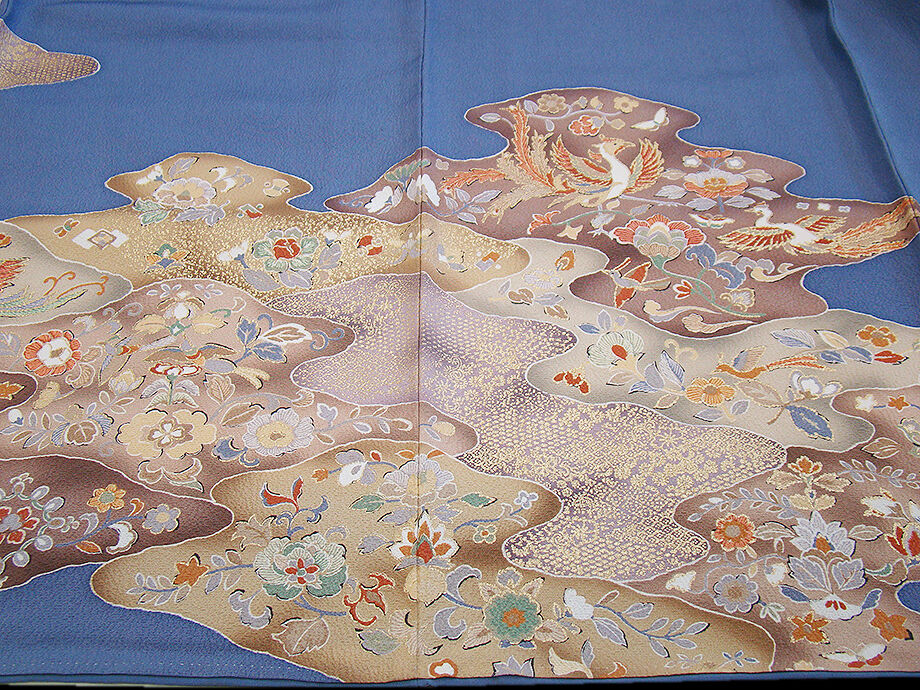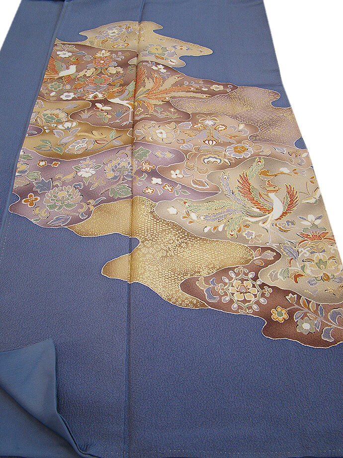 | 商品説明 | こちらのお品は「袷」ですので10月から5月までお召頂ければと思います。 しなやかな手触りの着心地良いぽってりとした重めの極上ちりめん地の生地、 濃い青藤色地に薄茶、ベージュ色ぼかしに花草、鳥柄等の染柄に金彩加工仕立て、 気品に満ち溢れた彩りが正統派のお着物として一枚は欲しい逸品の素敵なお着物です。 八掛は共色(正絹)、背に「丸に並び鷹の羽」の紋1ヶ、幅広い年代の方にお召頂けます。 |