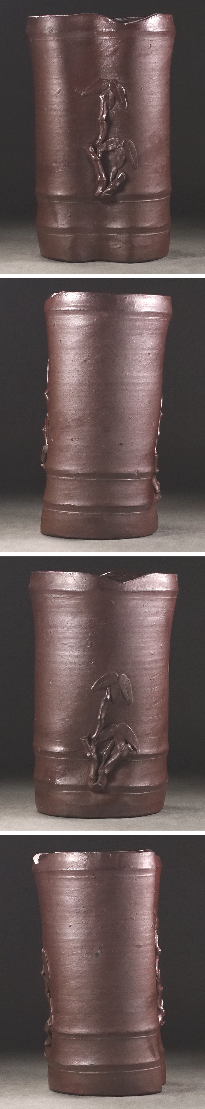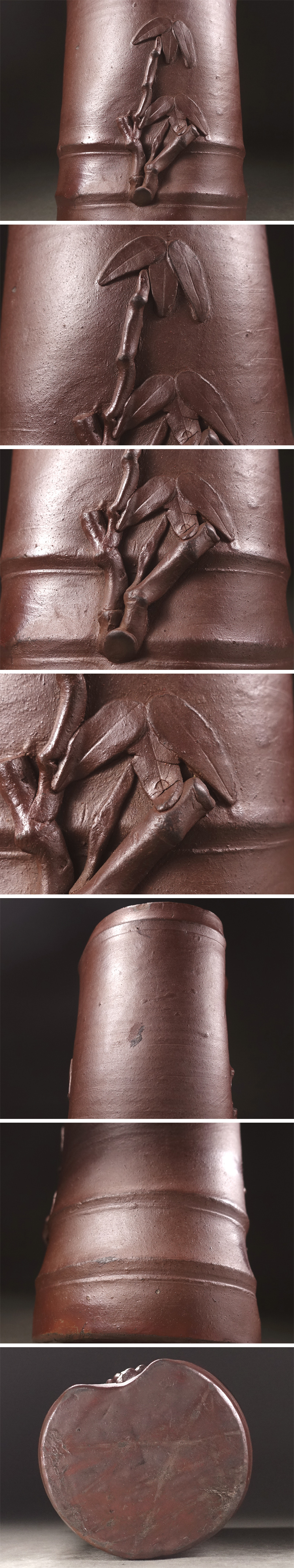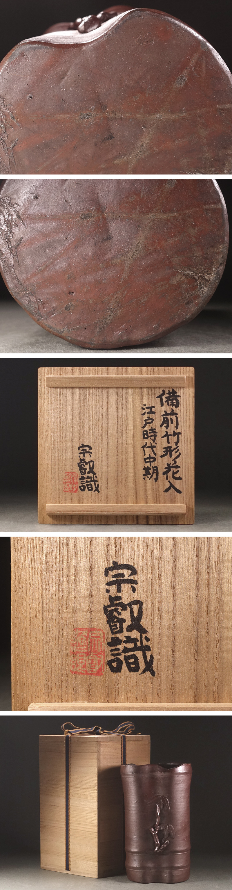∇花∇岡田宗叡鑑定 江戸時代中期 古備前貼花竹文竹形花入 高さ21cm 岡田宗叡鑑定箱付 收藏