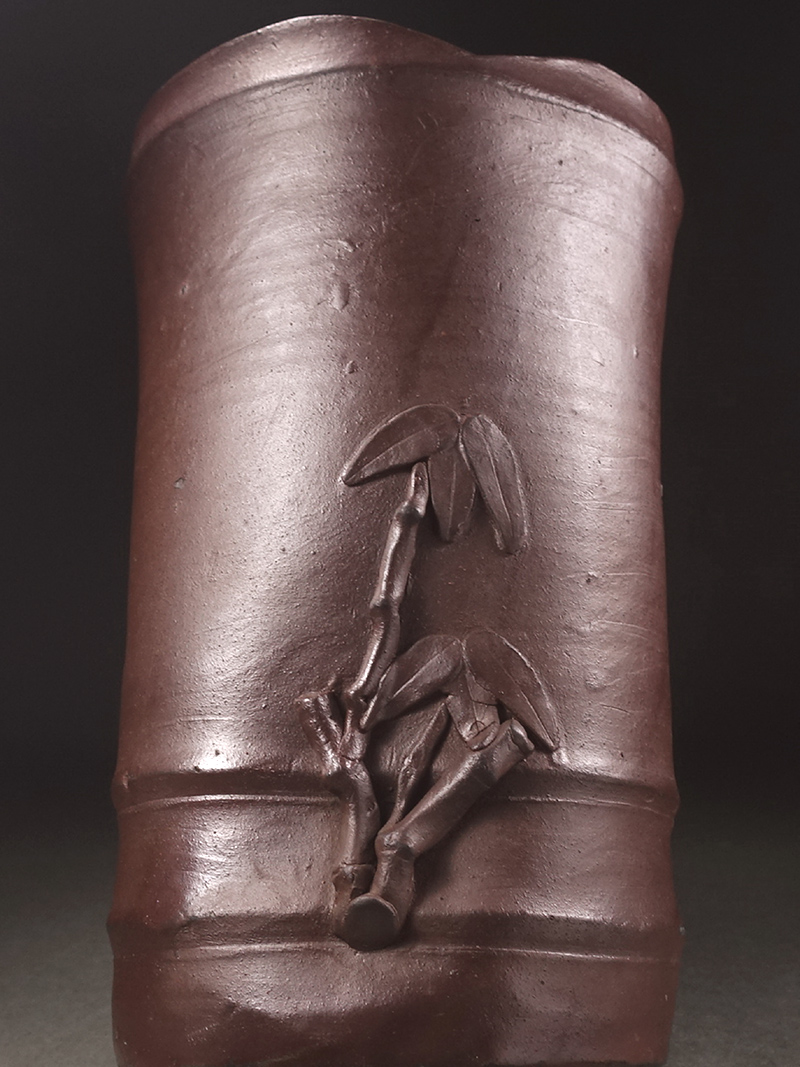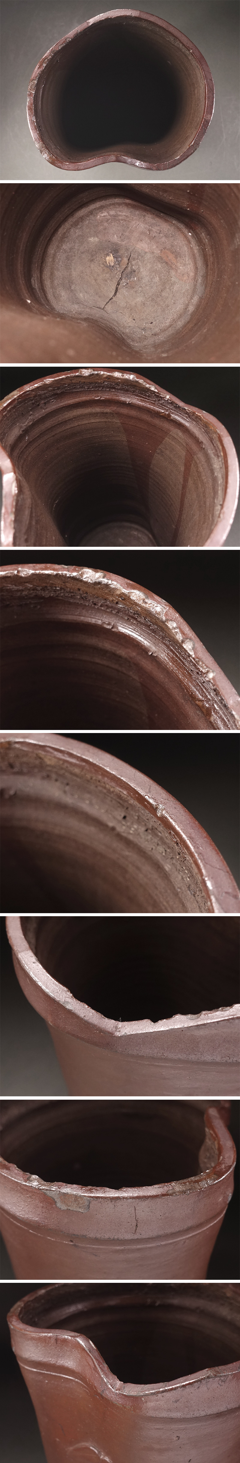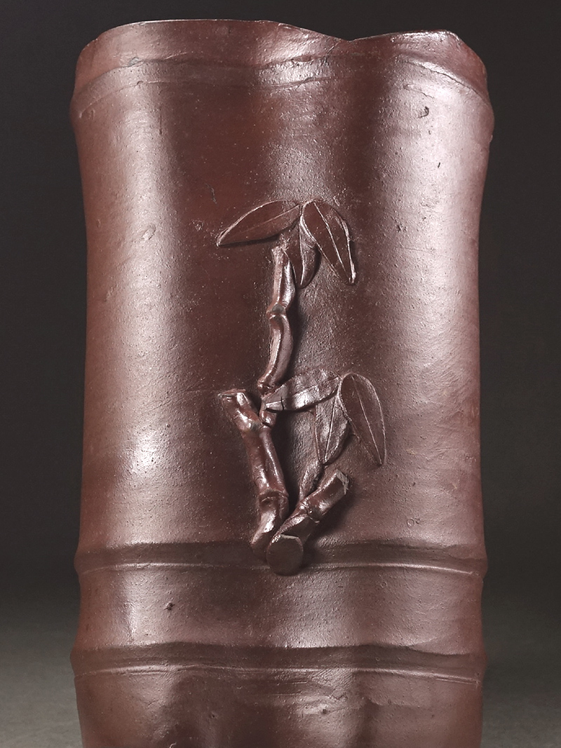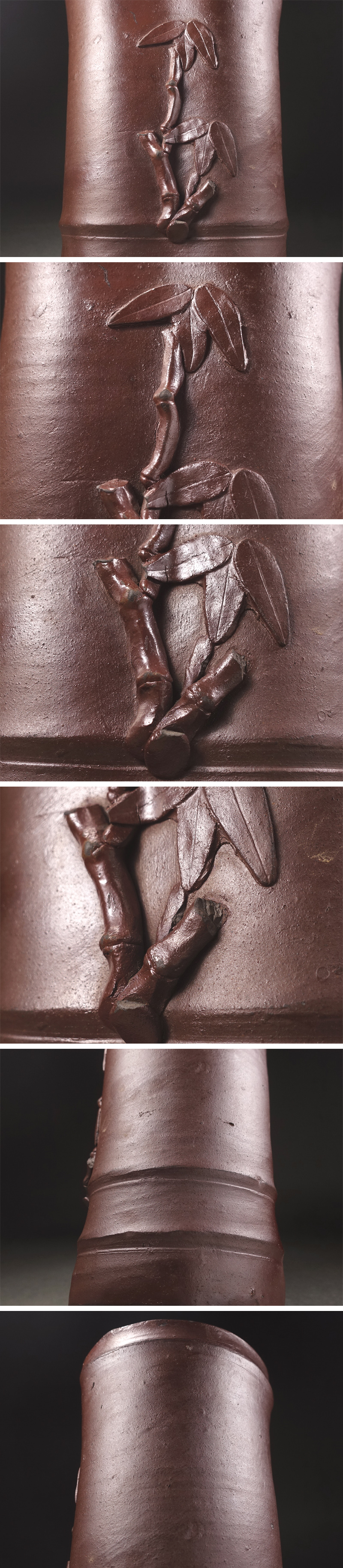 ∇花∇岡田宗叡鑑定 江戸時代中期 古備前貼花竹文竹形花入 高さ21cm 岡田宗叡鑑定箱付 收藏
