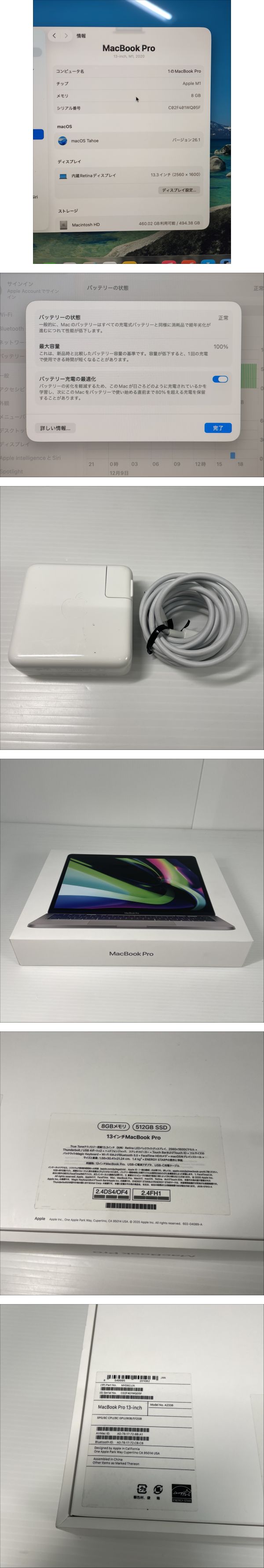 ※他 出品商品との「同梱発送不可」となります。 ※おまとめ依頼があった場合でも「個別取引」となりますので予めご了承くださいませ。 ※弊社指定の配送方法となりますので、配送方法変更不可となります。 (沖縄県は(60サイズ以上の商品)ゆうパックのみでの配送) ※領収書発行可能 (領収書は商品同梱となりますのでメール送信・別住所への郵送はできません) 領収書が必要な場合は、支払完了前までに取引ナビにてお知らせください。 ※落札より2日以上ご連絡が無い場合は「落札者都合でのキャンセル」となります。 ------------------------------------------------------------------------------------------- 【機種】MacBook Pro 13-inch 【容量】メモリ8GB/ストレージ512GB 【型式】MYD92J/A 【カラー】スペースグレイ 【動作】通電確認済 ※充電可能/電源入ります(出品時) ※美品としての出品ではございますが、目立つ大きい傷等はございませんが、小傷等ございます。長期保管の中古商品、現状でのお渡しとなりますので、画像にてご確認の上ご入札お願いいたします。 【バージョン】26.1 ※付属品につきまして、画像に写っているものが全てとなります。 ※アクティベーションロックは解除済みの商品となります。 ※商品の詳細につきまして、専門業者ではございませんのでお答えできかねる場合がございます。 ※状態に関して、経年劣化による、小傷や汚れ等はご了承くださいませ。 見落としがある可能性も御座いますので、詳細は画像にてご確認頂き、画像にてご判断頂ける方のみ御入札をお願い致します。 ※電化製品・精密機器等の保証はございません。 | |||