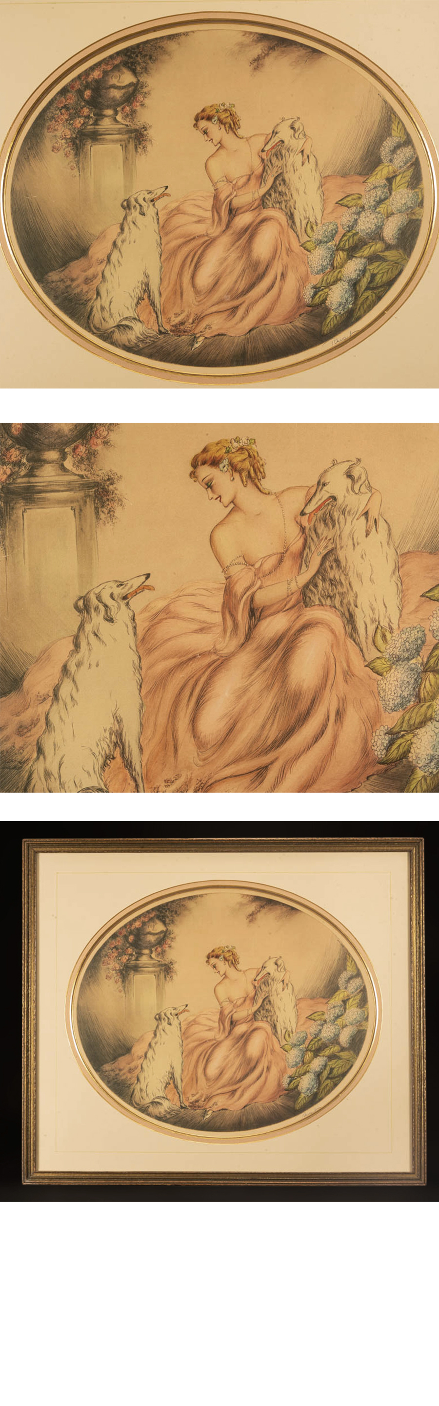 ●L.C.ルナール 作 アールデコ 1936年 リトグラフ 版画 女性とロシアン・ウルフハウンド● 收藏