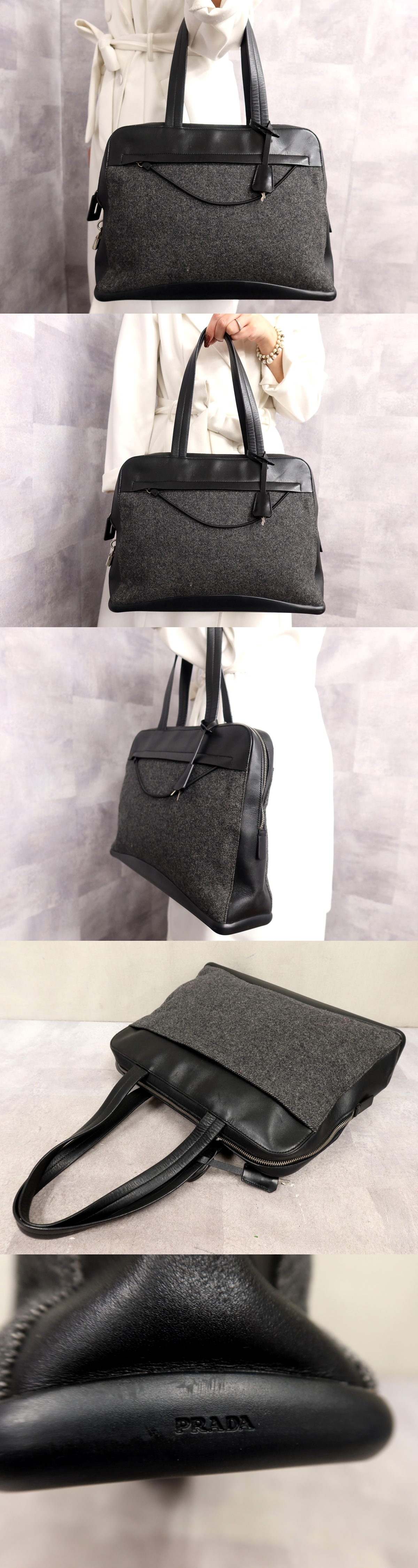 ●超美品●PRADA プラダ●ロゴ型押し●ウール カーフ レザー●ハンド バッグ●黒 グレー●SV金具●イタリア製●ヴィンテージ●B5●Js63976 收藏