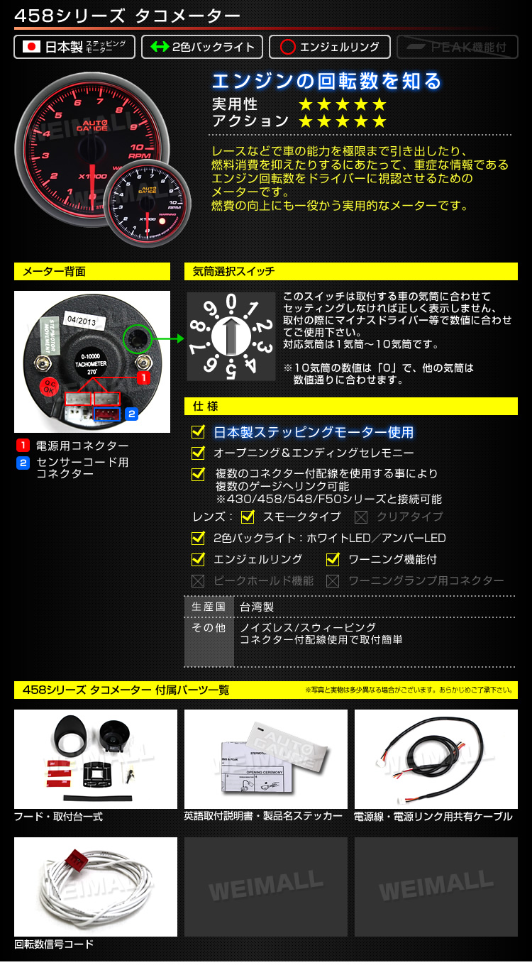 アナタの車をスタイリッシュにドレスアップ! 外装以上に内部をオシャレにしたい!そんな方への定番アイテムです。 【商品仕様】 メーター径60mm 日本製ステッピングモーター 2色バックライト:ホワイトLED/アンバーLED エンジェルリング スモークレンズ ノイズレス/スウィーピング 複数のコネクター付配線を使用する事により複数のゲージへリンク可能 コネクター付配線使用で取り付け簡単 オープニングセレモニー(イグニッションをONにすると針が1度MAXまで移動) エンディングセレモニー(イグニッションをOFFにするとフェードアウトしながら消灯) ※商品コード 430/458/548/F50と接続可能 【付属品】 [水温計] 英語版取扱説明書 電源線、センサー、ハーネス付センサー線 複数のコネクター付配線 取り付け台、メーターフード [油圧計] 英語説明書 電源線、センサー、ハーネス付センサー線 複数のコネクター付配線 取り付け台、メーターフード [バキューム計] 英語版取扱説明書 電源線、センサー、ハーネス付センサー線 複数のコネクター付配線、取り付け台、メーターフード T字接続金具とろ過装置 [タコメーター] 英語版取扱説明書 電源線、ハーネス付センサー線、複数のコネクター付配線 取り付け台、メーターフード ※もちろん新品未使用品です 商品コード:458WOPVR60 |