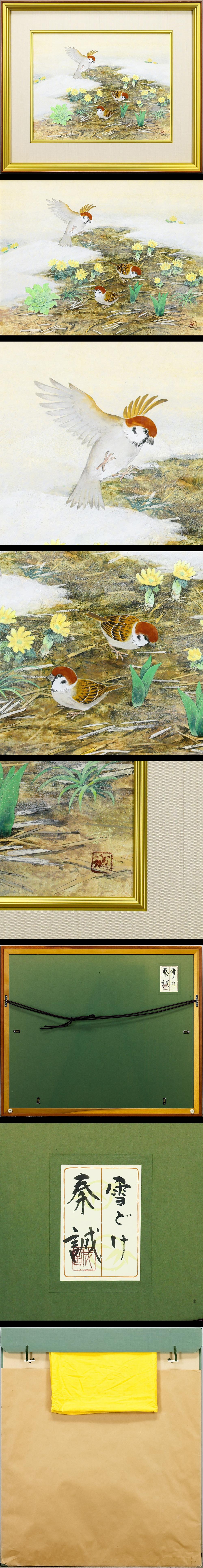 【真作】【WISH】秦誠「雪どけ」日本画 10号 金落款 金箔 共シール ◆春の野辺に集う愛らしい雀 〇日本美術院院友 日本の四季 #26012108 收藏