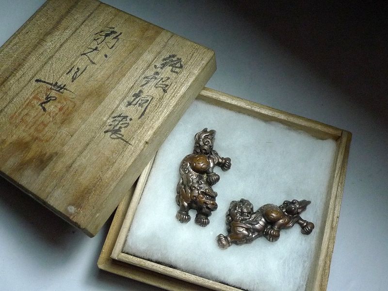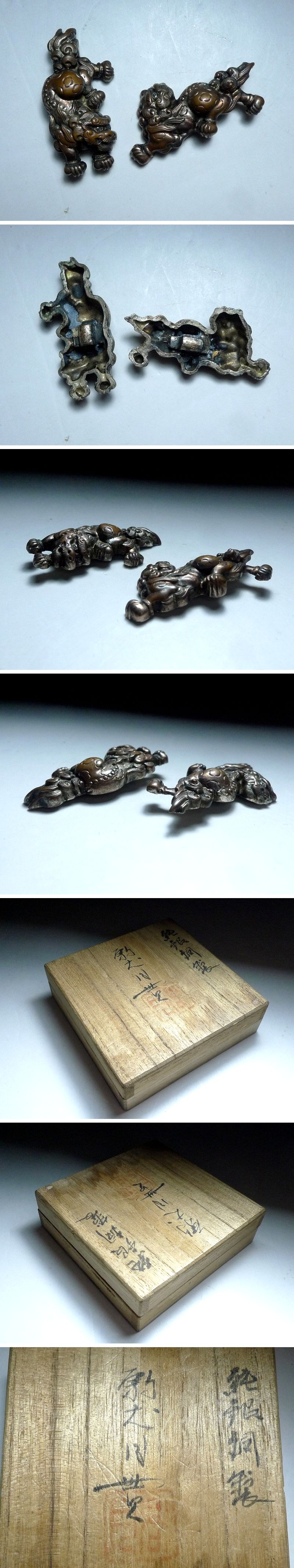 刀装具 純銀銅製 狛犬 目貫 一対 共箱 時代武具 金具 小道具 日本刀 獅子
