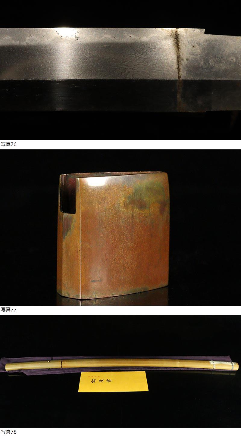 | ■刀剣のサイズ表示について 元幅・・・焼出し付近を測定しております 先幅・・・横手筋付近を測定しております 元重ね・・・焼出し付近の厚みを測定しております 先重ね・・・横手付近の厚みを測定しております (多少の誤差はご容赦ねがいます) ■銃砲類のサイズ表示について 全長・・・銃身先から台木尻までを測定しております 銃身・・・台木を除いて金属部分を測定しております (多少の誤差はご容赦ねがいます) 当社が出品する刀剣類は、入手した時の状態のまま出品しております。 ハバキ、小道具等も当社で調整したり付け替えたりはしておりませんので、合わせではないかというクレームは一切受け付けません。 刀身の疵も隠すことなく載せておりますので写真をよくご覧になってご入札ください。 疵に関して、説明がない等のクレームは一切受け付けません。 写真ではわかりにくい部分は質問欄やお電話でお問い合わせください。 但し、説明欄に表記のない刃切れに関してのみ返品やご相談に応じます。 ※ご落札しご購入されお手元に届いてから20日以内に 登録証に記載されている各都道府県の教育委員会にご連絡し 登録証の所有者変更を必ず行ってください | |||