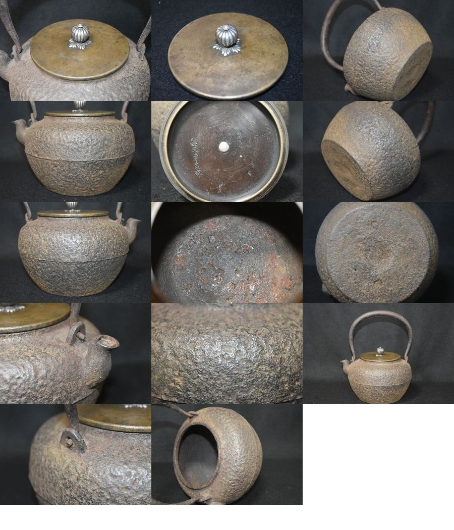 【光成】龍文堂・井上造「銀摘・岩肌紋・黄銅重蓋・時代鉄瓶」水漏無・花押有