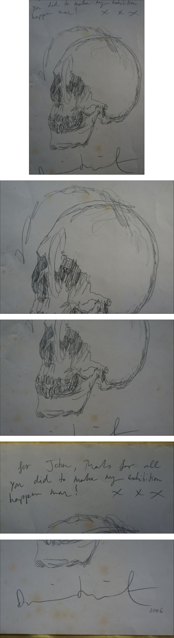 | 商品説明 | Skull(骸骨)を最大のモチーフとしている、ダミアン・ハーストの鉛筆/紙の肉筆原画です。2022年に世界的なオークションハウスであるクリスティーズに出品され、3,276ポンドで落札された作品です。クリティーズのHPにアクセスし、オンラインオークションの過去の落札履歴のなかのDamien Hirstを検索すると出てきます。Johnに宛てた一文(ダミアン・ハースト展の開催に尽力してくれた礼文)、鉛筆画、サインなどクリスティーズで落札された作品と一致します。一応こちらでプリントアウトしたものを提供します。さらにサイン鑑定の第一人者フランク P. ガロの鑑定書(真正等級:10点=最高点)が付属します。以上により作品は真作であることを示しています。 落札者でアクリル付きの額装をご希望の方はその旨をお知らせください。こちらで取引のある額縁専門店に発注します(実費のみ頂戴します)。 なお、即決落札者でご希望の方には上記新品額縁を無料で提供します。こちらで任せていただきオーダーし額装して送ります。 制作年:2006年 サイズ:約30 x 23cm 状態:薄いシミが数箇所見られます。 <クリスティーズのデータ> オークション開催日:2022年7月5日 落札価格:3,276ポンド(約70万円) <注意事項>**必ずお読みください。下記の事項に同意された方のみ入札してください。**・後のトラブル防止のため、新規の方、悪い評価が全体の5%以上ある方、および落札者の都合によるキャンセル歴が3回以上ある方は入札をお断りします。入札された場合は分かり次第入札を取り消しさせていただきます。新規の方で、どうしても入札したいと言う方は、質問欄に氏名、住所、電話番号をお知らせ下さい。(回答はしないので公開はされません) |