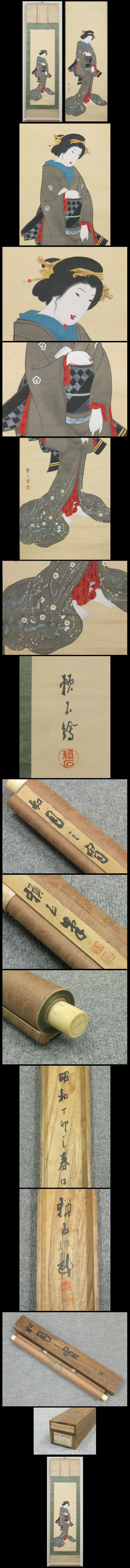 【心庵】掛軸 澤本頼石(沢本頼石)絹本「如月の宵」美人画/肉筆 共箱 真作 富山県 B777 收藏