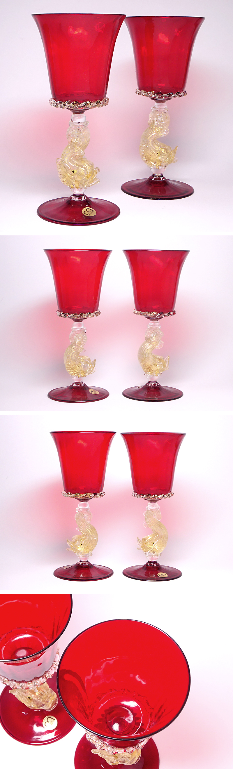 慶應◆イタリア 高級ムラノガラスの老舗【MAZZEGA MURANO】取扱品 銅赤ガラスワイングラス 金彩ドルフィンステム ペア 証明書付b3 收藏