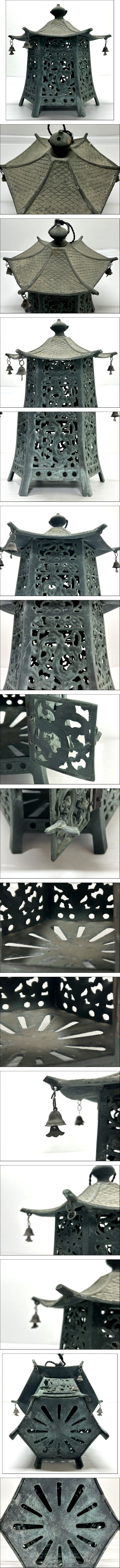 | 唐銅 古金属製 唐草透文 六角 吊り灯籠 行灯/庭飾/照明/燭台/灯篭/燈篭/提灯/古民具/古民家/和風/時代物/年代物 | |