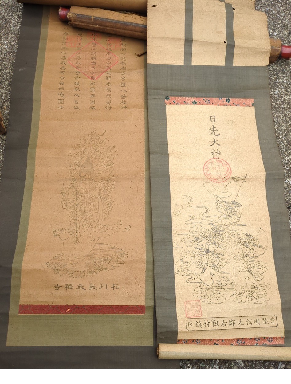 掛軸 仏画 護符 仏教関連 54本 大量一括まとめて 江戸期 明治期 古玩 中国 肉筆画 木版画 泥絵 浮世絵 神道 密教 梵字 呪物 和本 古文書