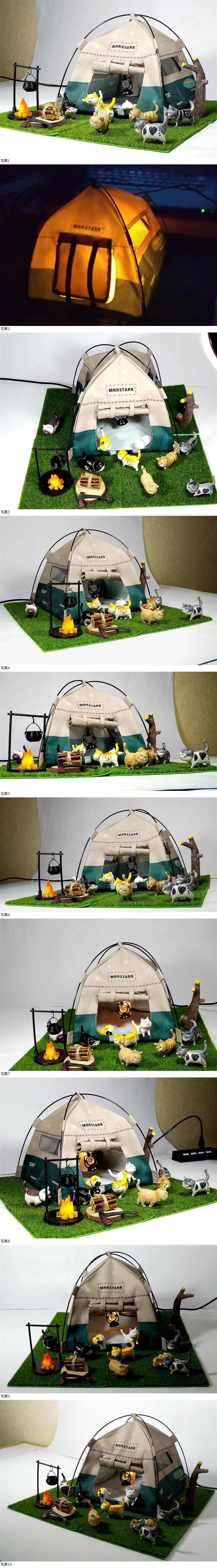 ●完成品・猫キャンプセット(猫・テント・キャンプ用品・芝生)テント内部照明付き
