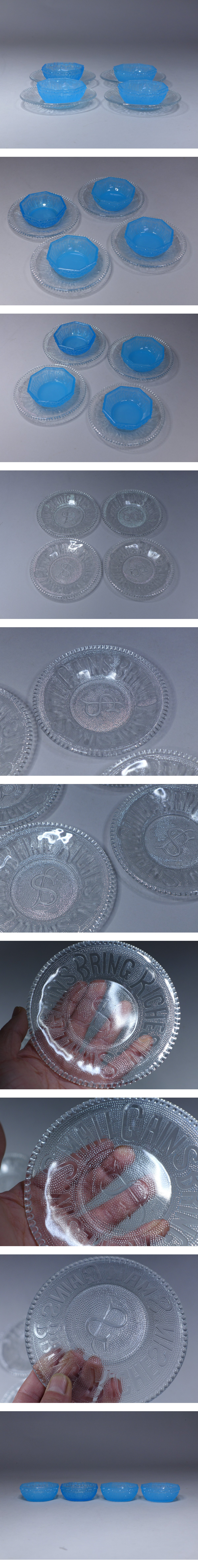 明治~大正 プレスガラス SMALL GAINS BRING RICHES IN 小皿 4枚 と青プレス硝子4客まとめての出品です。無疵状態良好。SMALL GAINS BRING RICHES IN は直径:約13・8cm。青プレス硝子は高:約3・3cm/口径:約9・3cm程度です。状態など画像参照でお願いします。★★★★★★★★★★★★★★★★★★★★★★★★★最近、悪質な入札者が多く非常に迷惑をしております。新規IDや「非常に悪い・悪い」の評価の多い方の入札はお断りさせて頂きます。 仮に入札があった場合でも、発見次第入札を削除させて頂く場合がございます。