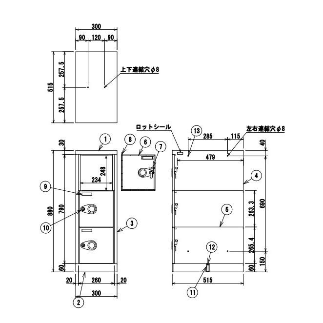| 仕様 | 完成品 耐荷重:一マス当たり10kg 連結穴加工(上下・左右)8Φ シリンダー錠キー2個付 名刺紙・セルカバー付 |