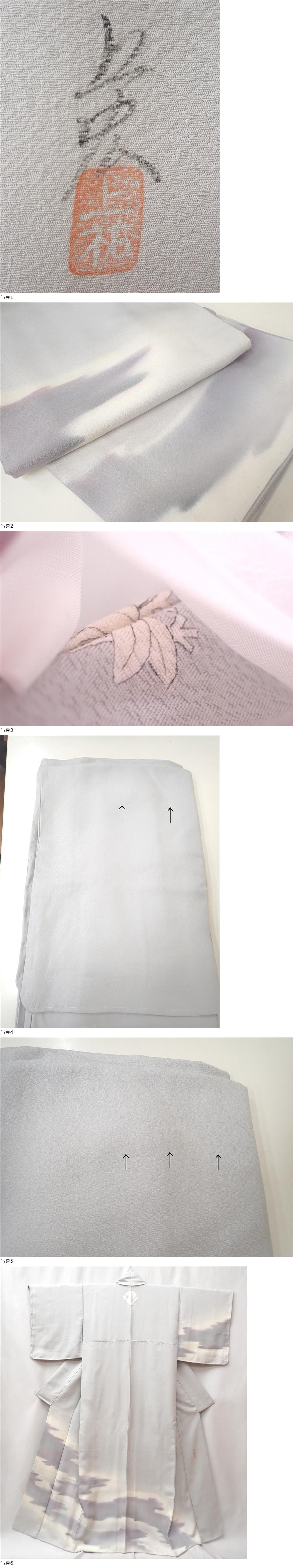 未使用 しつけ糸付き 作家物 正絹 訪問着 一つ紋 身丈157cm(+5.5cm) 裄丈62cm 薄灰 暈し 霞文 | ||||