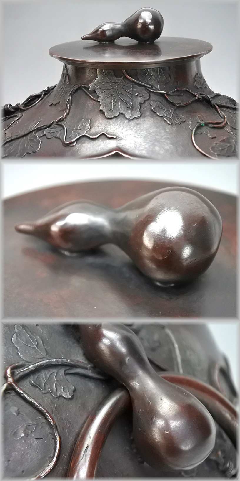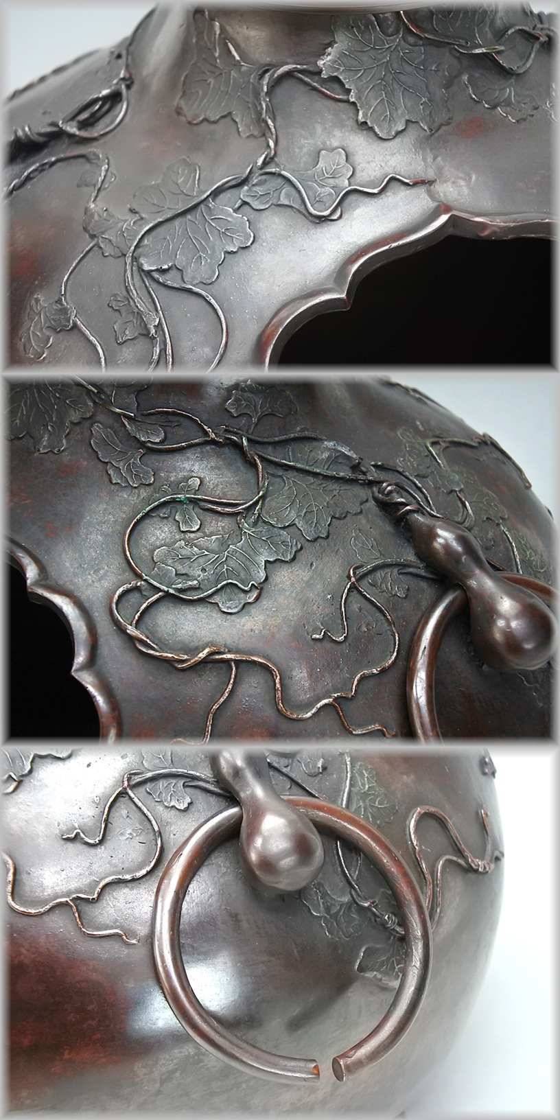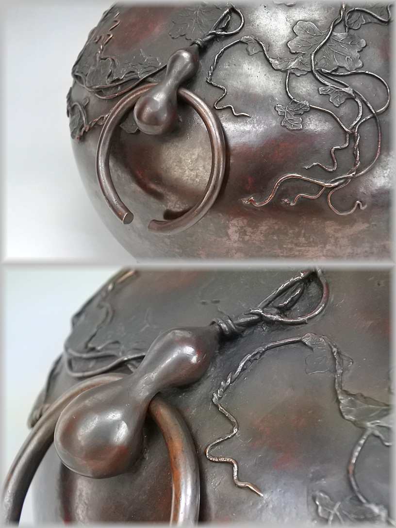 希少 未使用 美品 高岡銅器 金工師 宗信 作 銅製 唐草瓢取耳付取手 香炉 香炉 コレクション 保管品 三ツ足付香炉 銅製 和モダン 茶道具 收藏