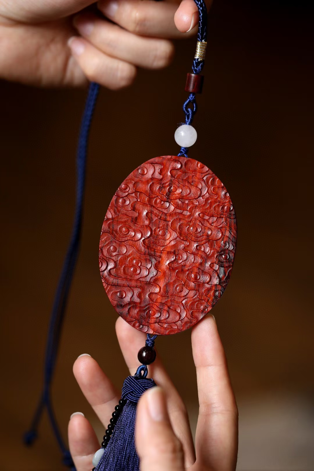 写真をご覧下さい。この品は、インドに産出される世界において、最も珍貴、稀少、高価な天然最高級小葉金星紫檀木原材で製作された高彫玉珮です!