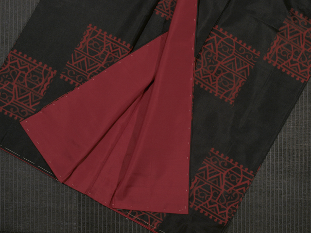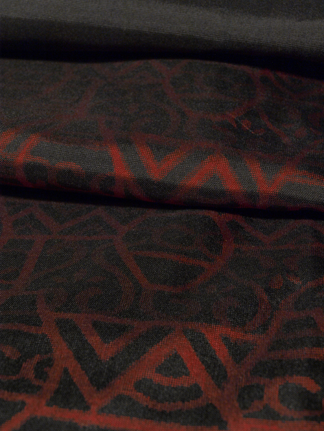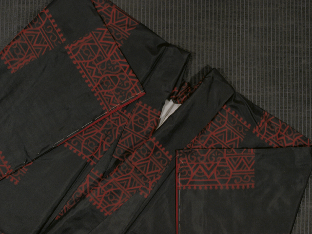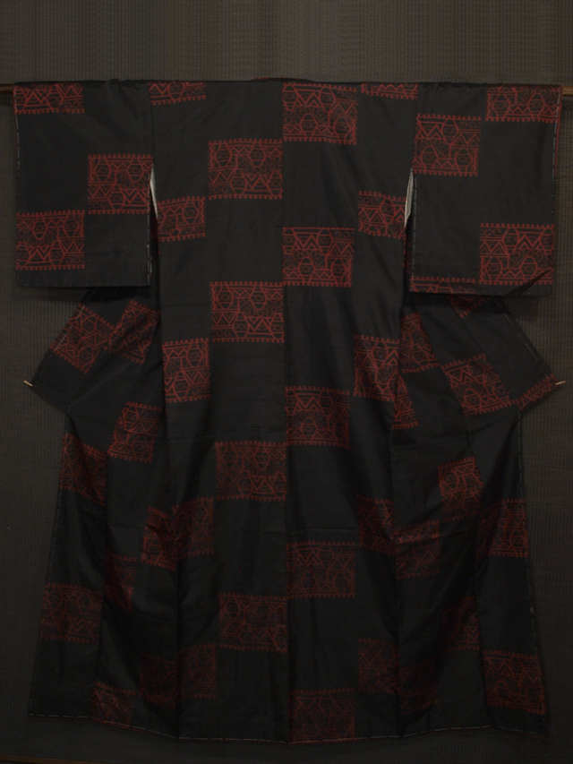 黒色の地に、猩々緋(しょうじょうひ)色で瓶などの配された更紗調の角の文様が絣で織り込まれた、大島紬です。袷仕立てです。 ななめに配された角がモダンで、粋な雰囲気です。さらりとした手ざわりの大島紬らしい地風です。 しつけ付きの仕立て上がり未使用保管品です。胴裏にスナップじみが数か所ありますが、そのほかに目につくしみやよごれ、褪色などのダメージはなく、とてもきれいな状態です。 |