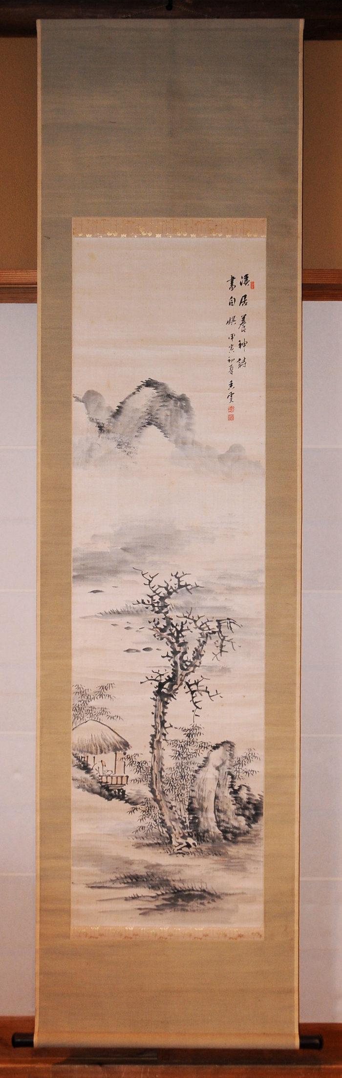 【真作】 山水画は光本(ぬめ)に描かれており製作年代は 甲寅、大正3年初夏です。 表具は一文字金襴の上等な元表具で良い状態です。 軸先は紫檀です。 賛は渓居養神詩書自〇、甲寅初夏 香雲です。 表具は一文字と中回しに金襴を使用した上等な表具です。 良い状態です。 ※撮影の際に生じた写り込みなどがございます。 ご理解の程よろしくお願い致します。 |
