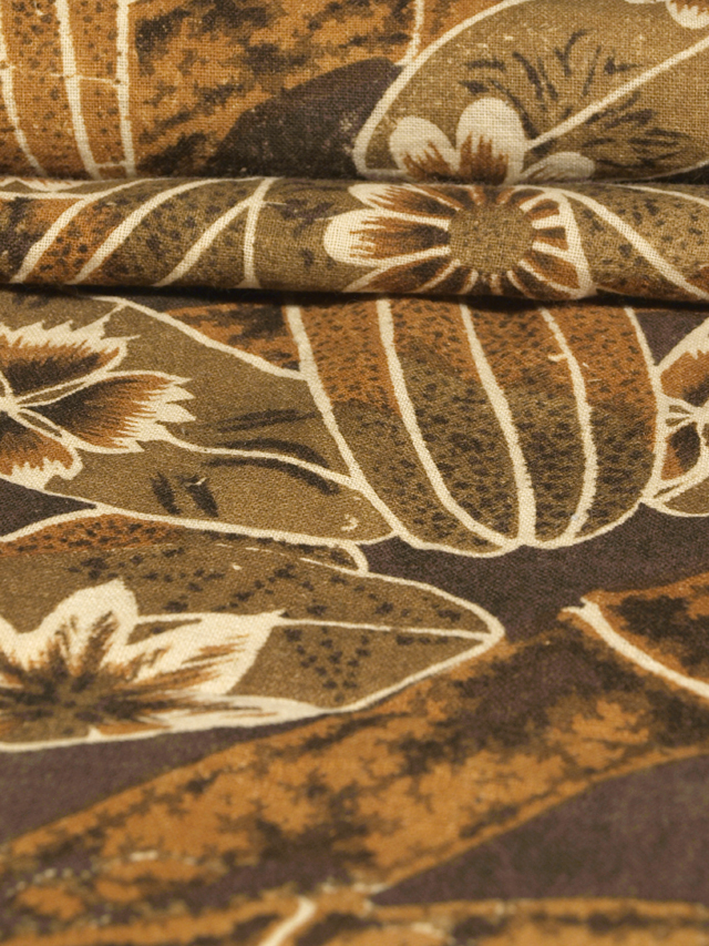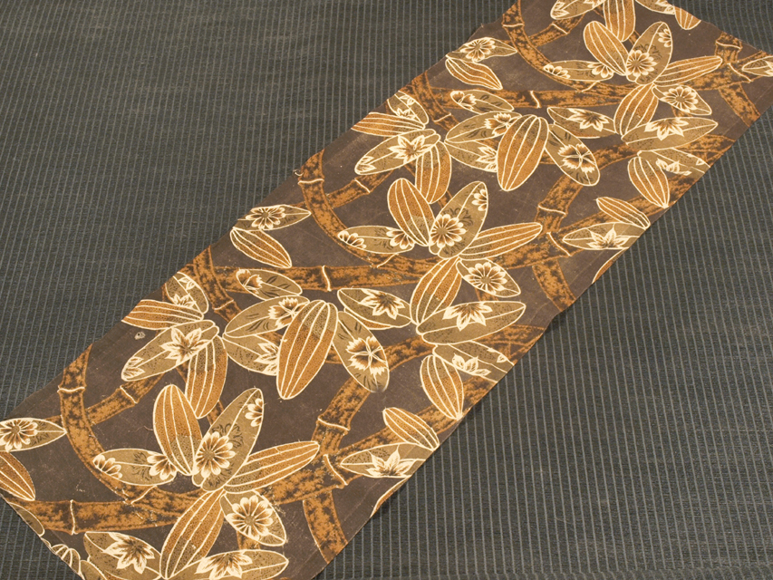濃いめの媚茶(こびちゃ)色の地に、菊、楓(かえで)、撫子(なでしこ)の配された竹唐草の文様が染められている、綿の和更紗のはぎれです。 昭和初期ごろにつくられたと思われるアンティークのお品です。渋さのなかにかわいらしさが感じられる意匠です。 アンティークなりのくすみやうすよごれがあるほか、両耳直近に縫い跡があります。また画像のとおり、下端から約 22cm の左耳直近に直径約 1cm の小穴が 1 か所あります。そのほかに目につく大きなしみやよごれなどのダメージはありません。生地の力はあります。 |