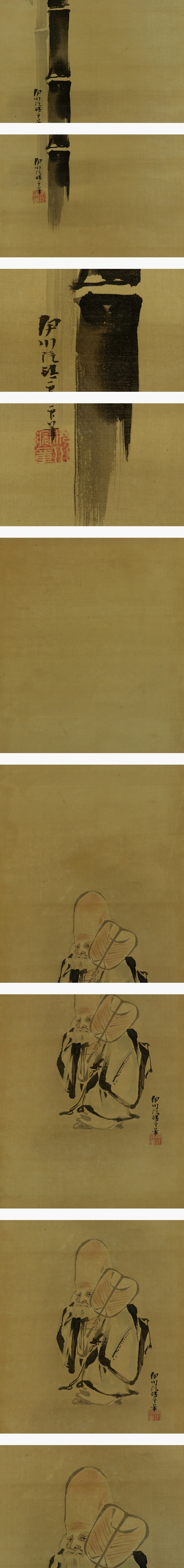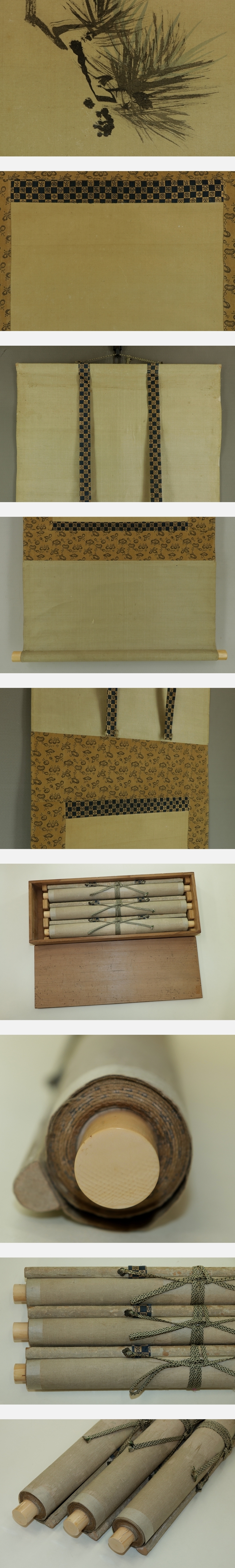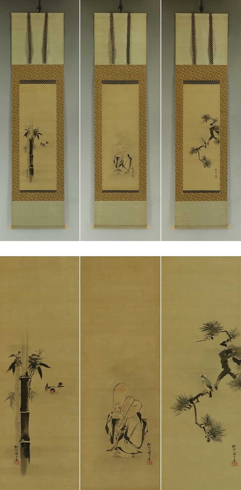 | №2301041【真作】狩野伊川院【三対幅・慶祝図】◆絹本◆合箱◆掛軸 | |