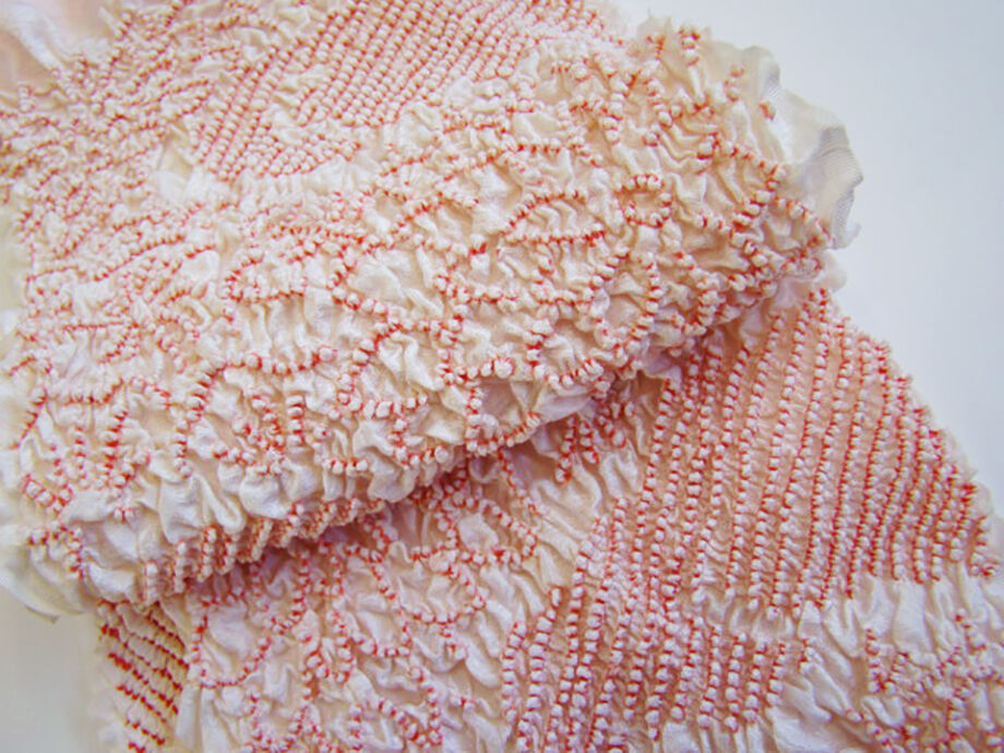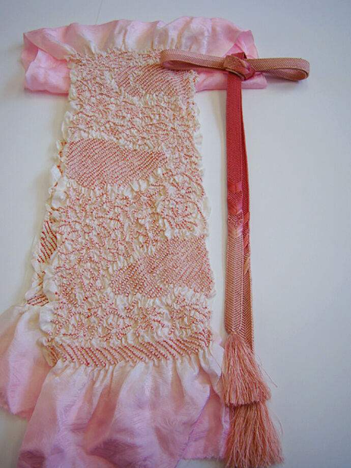 ●帯揚: 正絹。  撫子色地に白色ぼかしに赤色に絞り柄