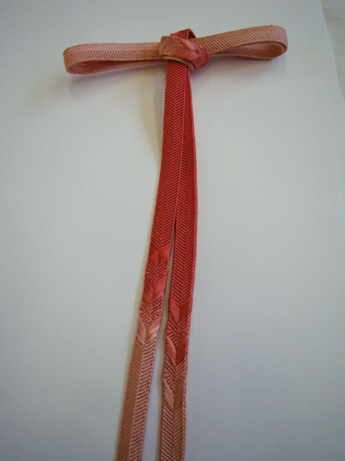 ●帯〆: 正絹。  薄い水柿、長春色地に金糸入りの組紐