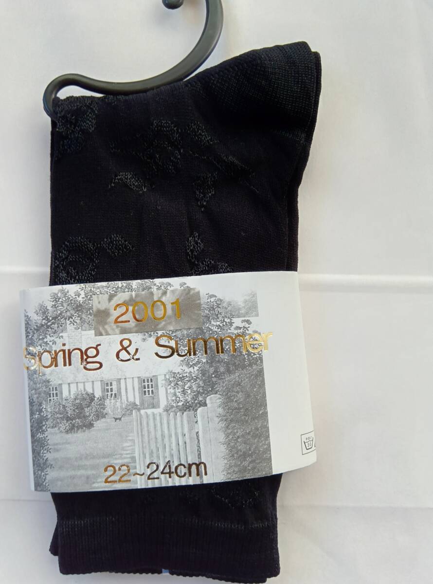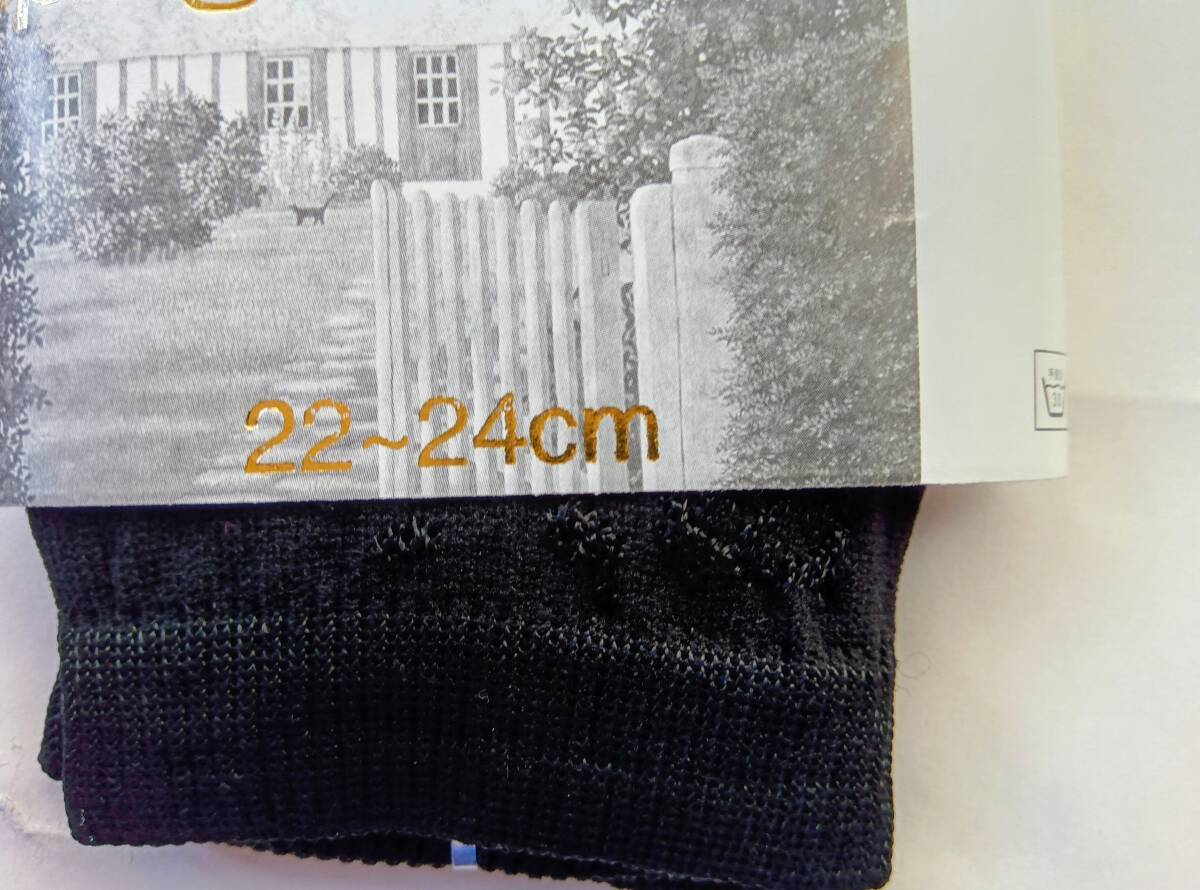 【サイズとデザイン】 サイズは22-24cmで、黒色のソックスです。デザインにはレースのディテールが含まれており、カジュアルにもフォーマルにも合わせやすいアイテムです。