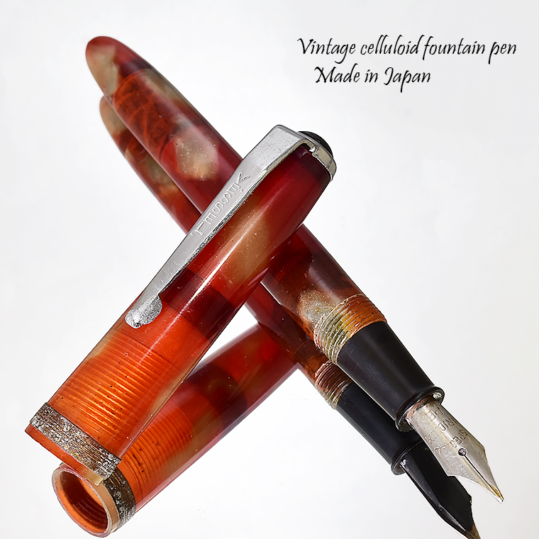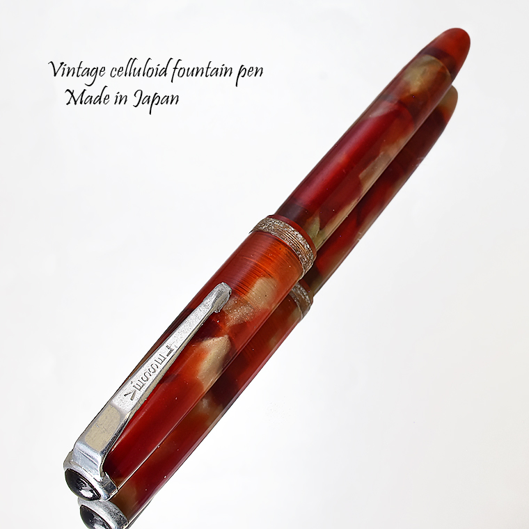 | ビンテージ セルロイド万年筆 レッドマーブル インク止め式 ペン先 F(細字)程度 レストア済み 希少な逸品 Made in JAPAN 日本製 ![]() こちらは、1950年代から1960年代にかけて製造された貴重なビンテージセルロイド万年筆。 終戦を迎えた70年程前、かつて日本の下町などでたくさんのセルロイド工場や加工場があった時代、 そういった工房で凄腕の職人さんが、ハンドメイドで仕上げた万年筆、 今回ご紹介するのは、そんな過去の貴重な万年筆をレストアしたものです。 職人さんの工房で保管されていた数少ないセルロイド万年筆を、彼の手によって 少しずつレストアしていただきながら、そしてその手法を教えていただきながら 出来上がったもの、譲ってもらったものです。 約半世紀の間、大事に保管されていたとしても、メンテナンスは必要なコンディションでした。 その為、その職人の指導の下、ひとつひとつ古い部品を取り換え、ニブの調整をするなど、 共同でメンテンナンスを行いました。 ![]() <レストアを行うにあたり…> ペン先選び、ペン芯とペン先がマッチしないと書けません。 (昔の万年筆は、パーツが手作りなので、一つ一つ適したものを合わせていきます。) 当時のペン先は、適合させて温度をかけて、緩めたり固定したりする必要があります。 筆記ができる状態にするまで多くの手がかかりますが、当時の職人さんが作ったペン先、 そのしなりや書き心地。それは現在の市販の万年筆では味わうことができないかと思います。 日本人が日本人の技術で日本の漢字を書くために研ぎだしたペン先。 そのペン先の本当の魅力を引き出すのが職人の技です。 ![]() 今回出品のペン先はF(細字)程度です。 日本製ニブのペン先をお楽しみください。 ![]() インクの吸入方式は【インク止め式】です。 日本独自の吸入方式だそうで、現在では万年筆の専門家でも知らない方が多いらしいのですが、 戦前は日本ではこの方式が圧倒的に人気であり主流だったそうです。 ●インクの充填方法 1. 尻軸を締めた状態で、首軸を回転させて外します。 2. 首軸をとり、上から見ると芯が見えますので、その芯の頭の少し下まで インクをスポイトで入れてください。 3. 首軸を元にもどします。 ●筆記の際の注意点 書く時には尻軸を少し緩めてインクがペン芯に行きわたるようにしてください。 そしてインクが出始めたら尻軸を回し締めて元に戻します。 (慣れるまでは、書き始める際に別の紙などで、尻軸を少し緩め、ニブを下にして、 万年筆を少し降りインクがポタリとでるのを確認してから、尻軸を回し締める方法が やりやすいと思います。) その状態で書き続け、インクが出なくなってきたら、再度尻軸を緩め、 インクがペン先に行きわたるようにし、またきちんと尻軸を元に回し締め、戻してください。 この毎回書く時に尻軸を開ける作業に慣れるまで時間がかかるかもしれませんが、 この方式の万年筆はインクの貯蔵量がカートリッジ式と比較してとても多く、 かつ確実に安全に長期にわたって保存が可能であり、慣れていく毎にその快適さに 気が付くことと思います。 またしばらく使用しない際には内部の部品が乾燥してしまわないように、 インクの代わりに少し水をいれた状態で保管しておくとよいそうです。 ![]() <セルロイドの魅力> 素材はセルロイド、 角度によって、次々と色味をかえるセルロイドは、まるで光が瞬いているようにも見えます。 また、滑らかな肌触りのセルロイドは、しっとりとした質感と 程よい重さをもっているので、本当に心地よいホールディングを堪能いただけます。 ボディサイズは、手の平に収まるサイズで、こじんまりとして見えますが、 当時日本から海外に輸出されていた万年筆の一般的サイズであり、 文豪たちが使う太軸万年筆ではありませんが、本当の実用サイズだと考えられます。 大きな万年筆に見慣れた今見ると、とてもかわいい万年筆に見えます。 ![]() ビンテージ万年筆の魅力は、時代を反映した独特なデザイン、現在では入手困難な素材。 そして、時間の経過とともに増すビンテージの風合いではないでしょうか。 使い込む程手に馴染み、愛着が湧いてくる楽しさは、ビンテージ万年筆でしか味わう ことができません。 貴重なビンテージ万年筆との出会いも一期一会です。 是非ご覧ください。 ![]() ************************************************************************* ≪万年筆詳細≫ビンテージ セルロイド製万年筆 レッドマーブル ニブ : スチール ※日本製 サイズ : F(細字)程度 機構 : インク止め 材質 : セルロイド 長さ : 約122mm 太さ : 約11mm(軸)/12.2mm(キャップ) 重さ : 約12g 付属品 :簡易発送用紙ケース ※こちらの商品は金属部などに経年変化が見られます。 特にキャップリングの錆が目立ちます。 ご使用に問題はございませんが、稀少なビンテージ品、 アンティーク品の特性としてご理解の上、ご入札ください。 ※モニターの環境により、画像と実物の色合いが若干異なる場