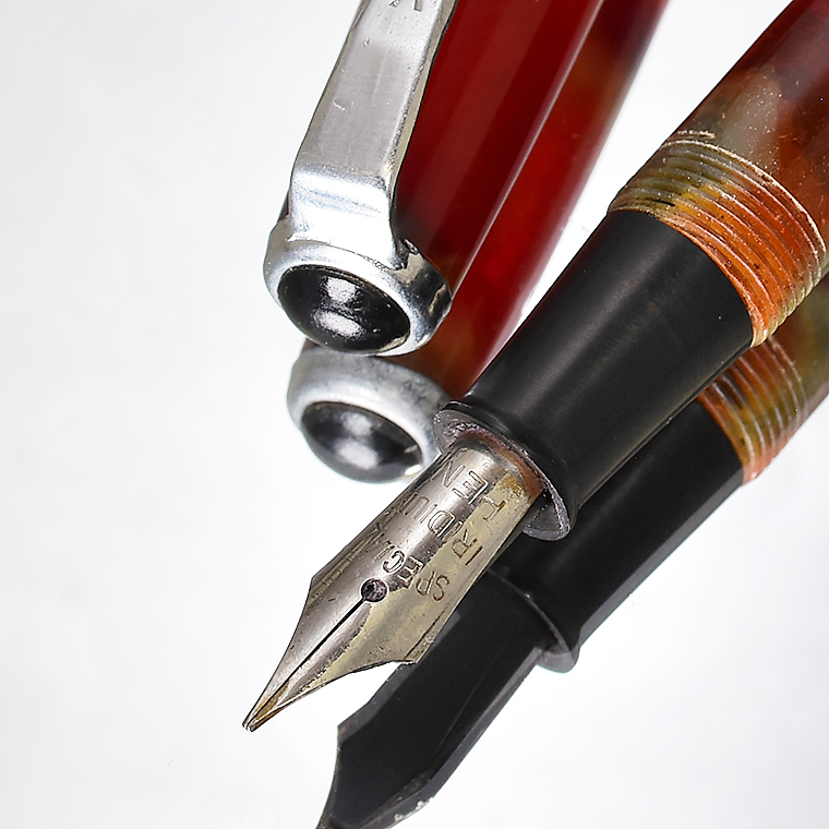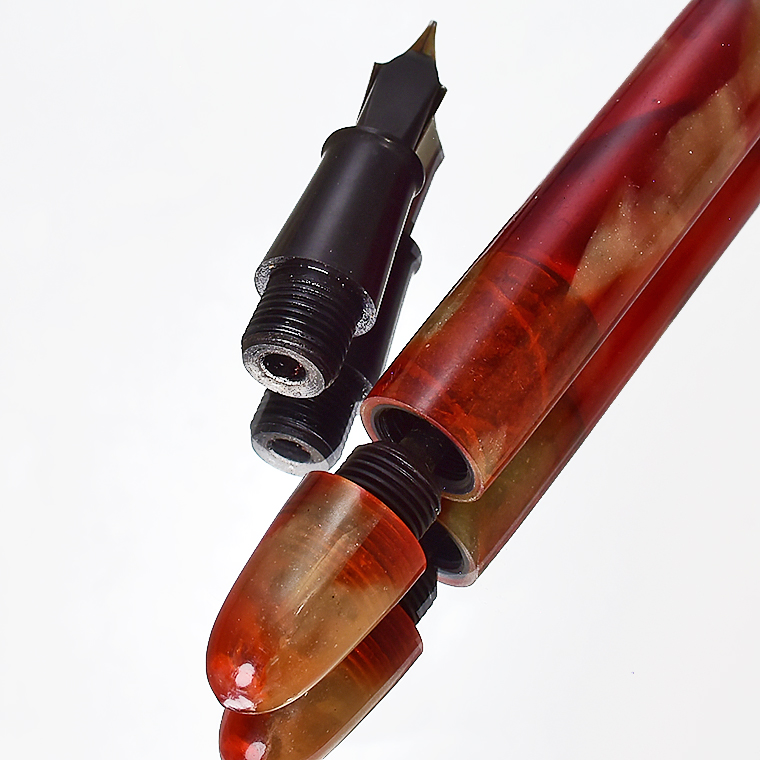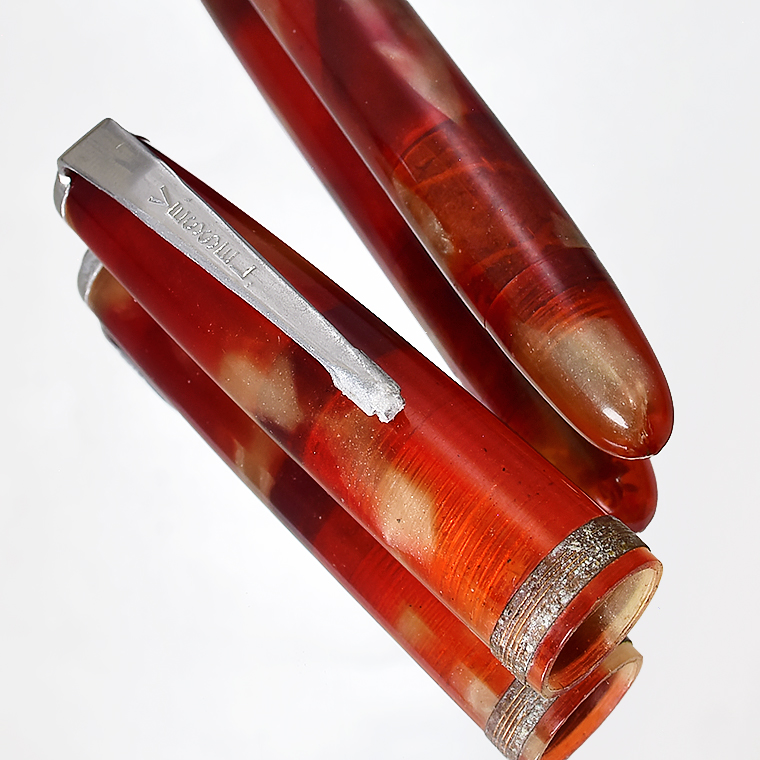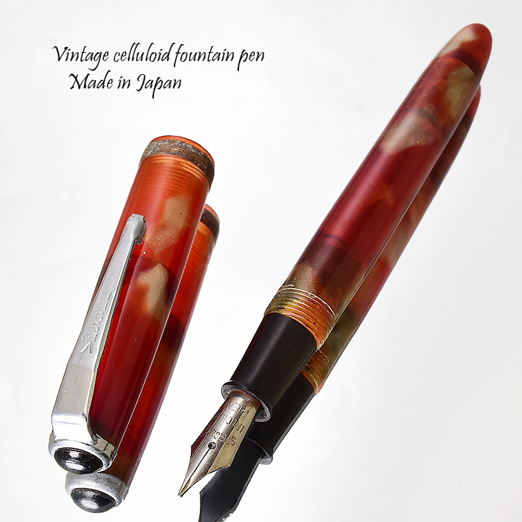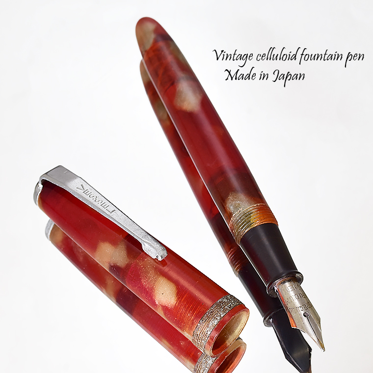 ■●ビンテージ セルロイド万年筆 職人が再生 希少な逸品 レッド マーブル F 細字 インク止め式 レトロ 透明 調整済 レストア 1円~/K399b 收藏