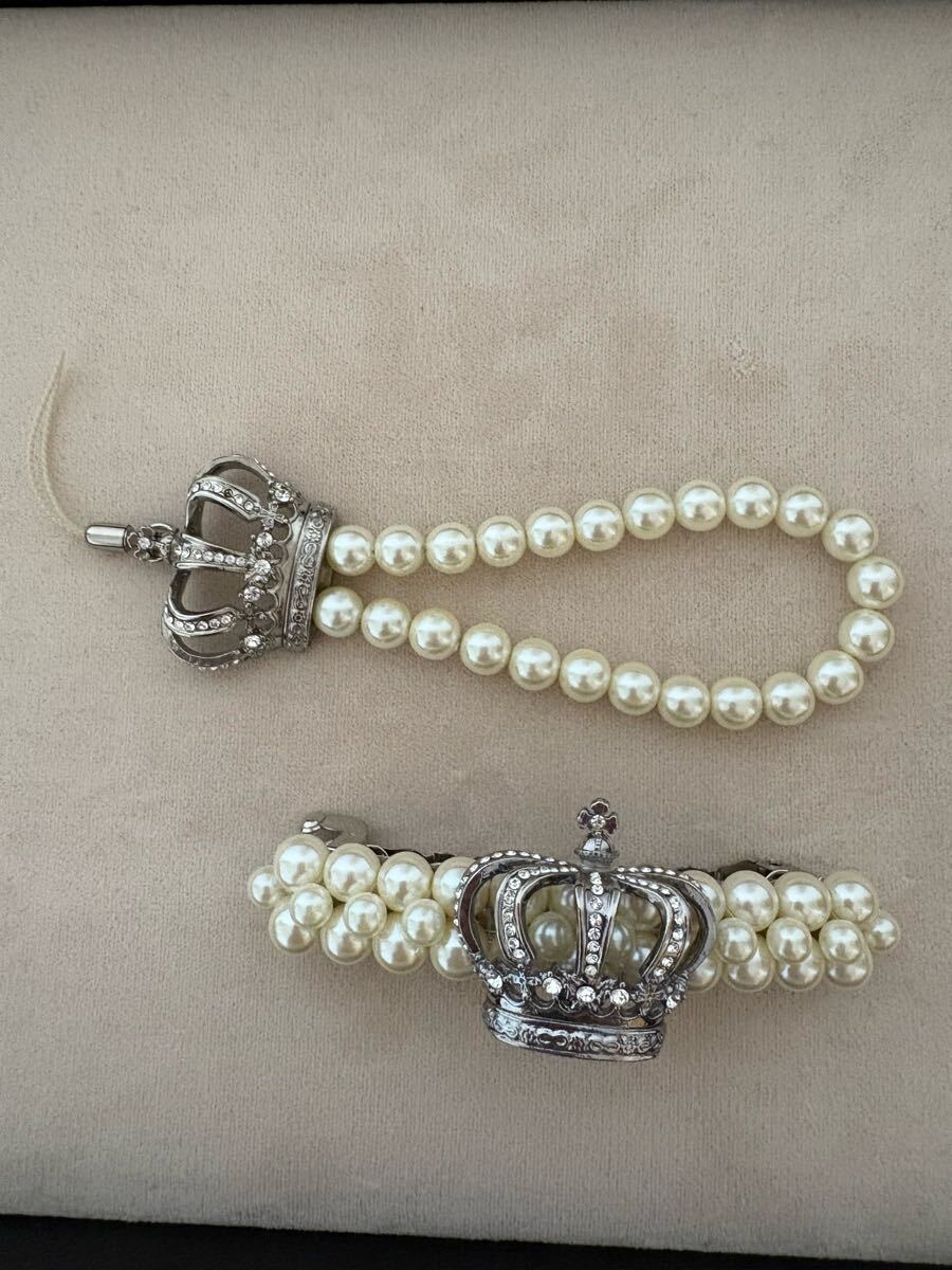 シルバー色の王冠のバレッタと携帯ストラップの2点セットです。バレッタのパール部分は約9cm ピンの部分は約7cmです。ストラップの長さは王冠とパール部分の長さが約11cmで、ヒモ部分はネジで取り外しできます。新品未使用ですが、自宅保管ですので、その点ご理解いただける方よろしくお願いします。