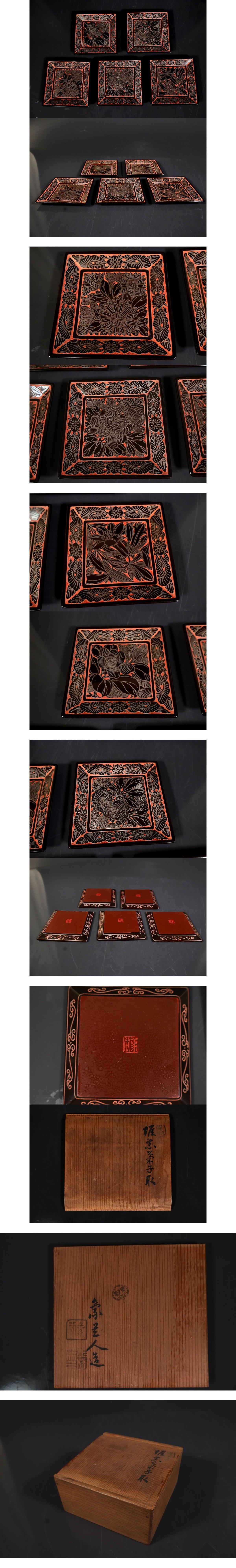 【小】5306 讃岐の名工 玉梶象谷作 讃岐塗 椎黒図替わり花文皿 菓子皿 五枚 共箱有 茶道具 收藏