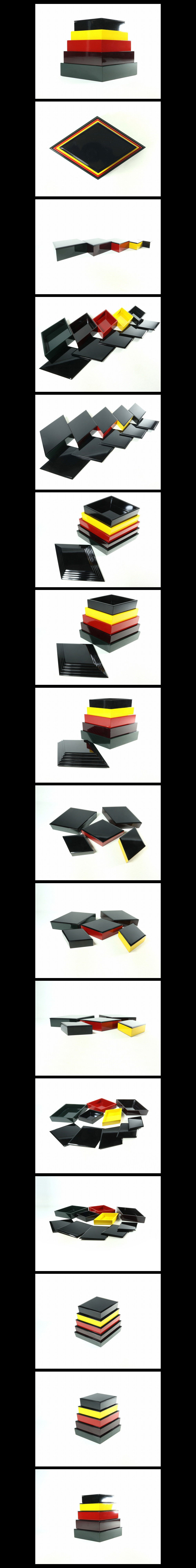 蓋は全て黒、胴は小さいものから順番に黒、黄、赤、栗色(少し透明感のある紅溜)、青(深緑)に