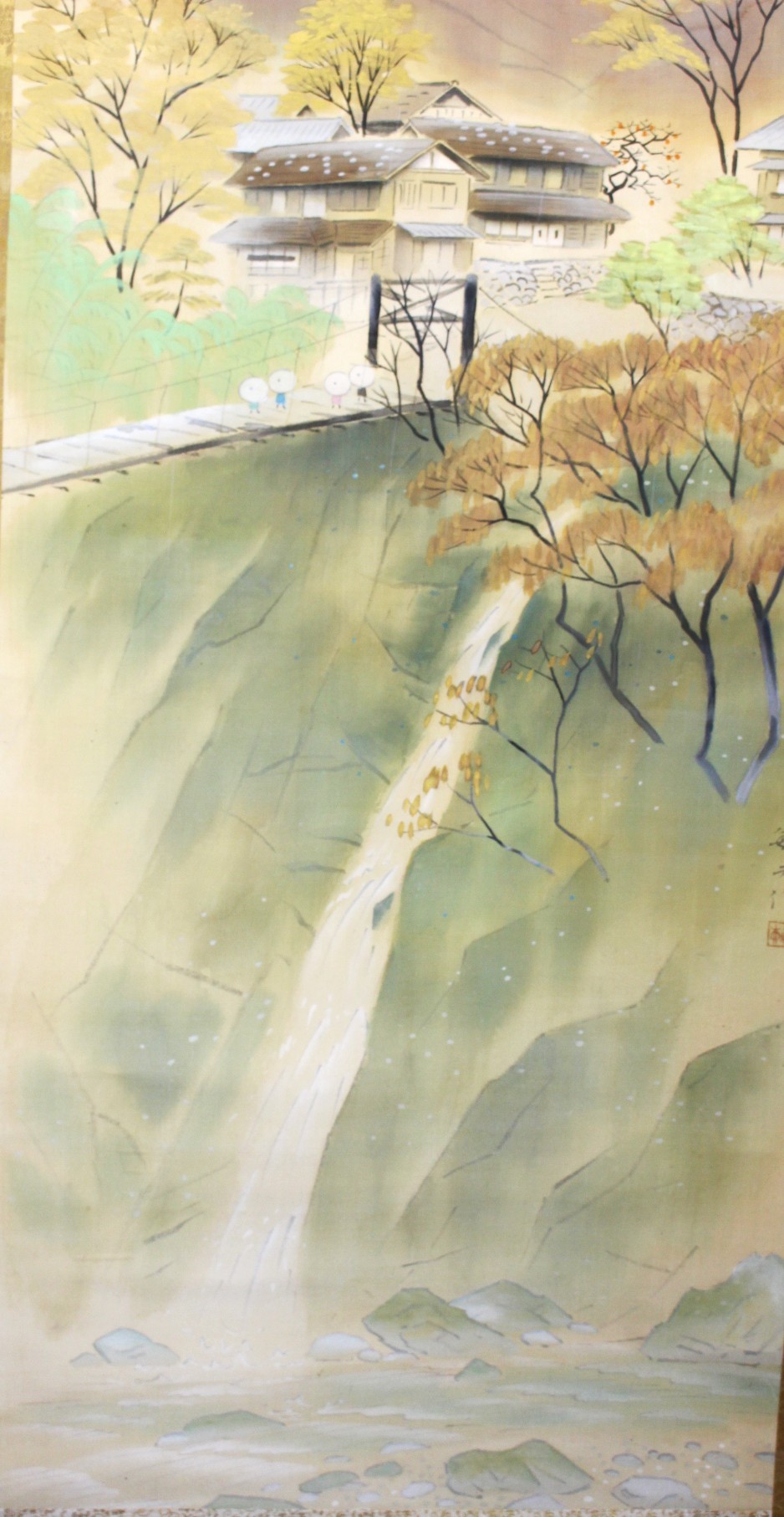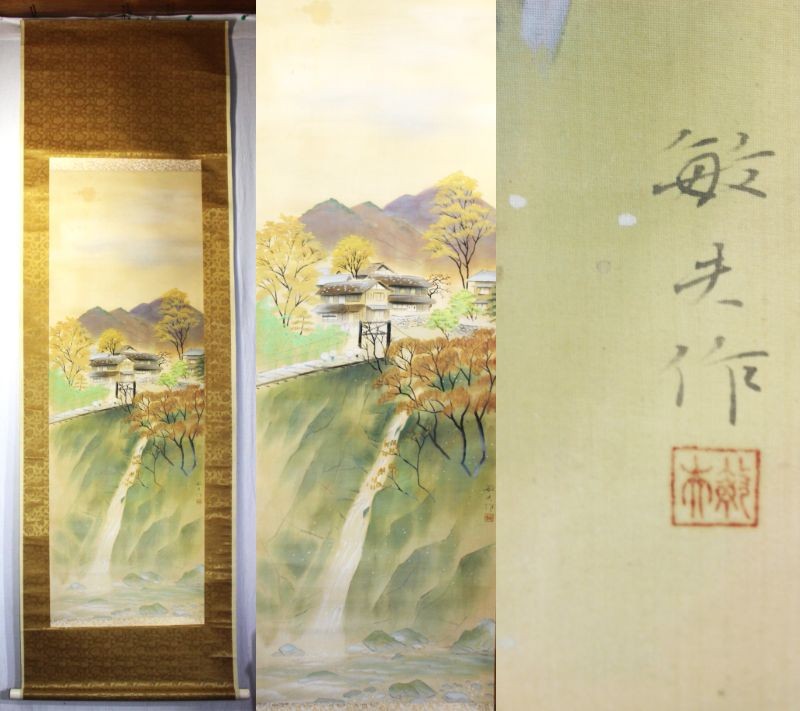 《真作》★三輪 敏夫【秋の旅籠】(仮題) 掛軸.桐箱入*師 松岡映丘・中村岳陵*日展会友*帝展.文展.日春展.欧遊*山里*愛知.物故*[桃] 收藏