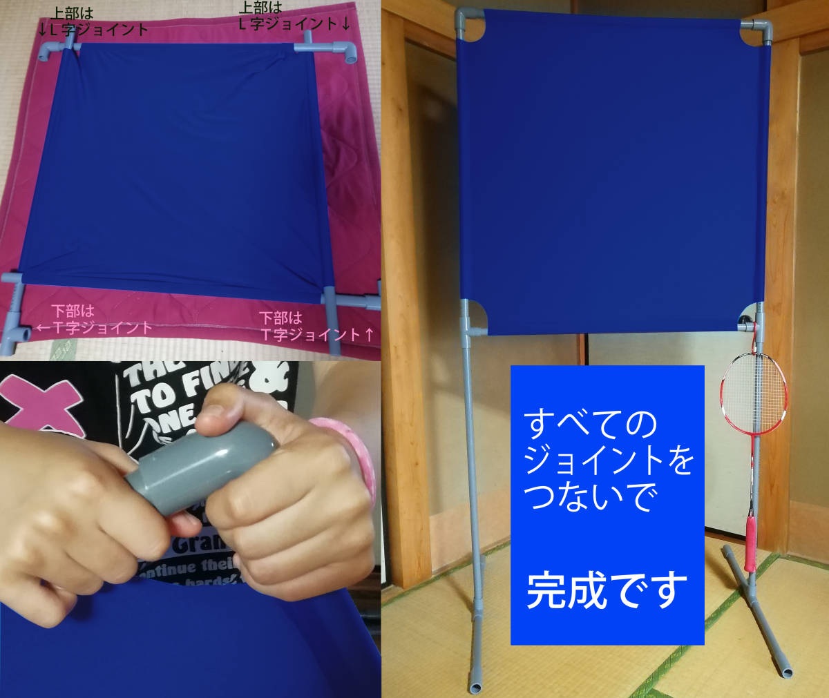組み立ては、布地にパイプを通してL字ジョイントとT字ジョイントで止めるだけの簡単作業です。