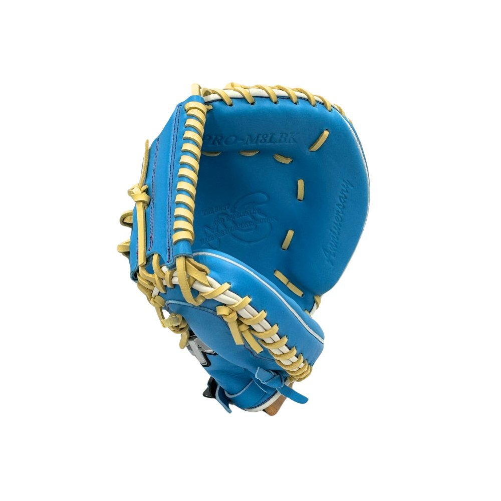 【このミットの大きさの目安】●青線は親指側の長さ、黄線は小指側の長さを示しております。(1インチ=2.54センチ) ※天然皮革のため、革の伸び等で多少誤差が生じる場合もございます。 |