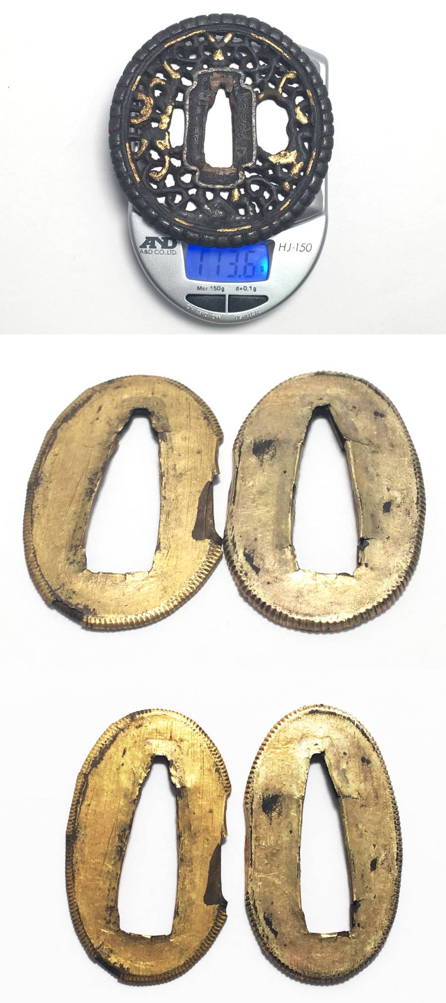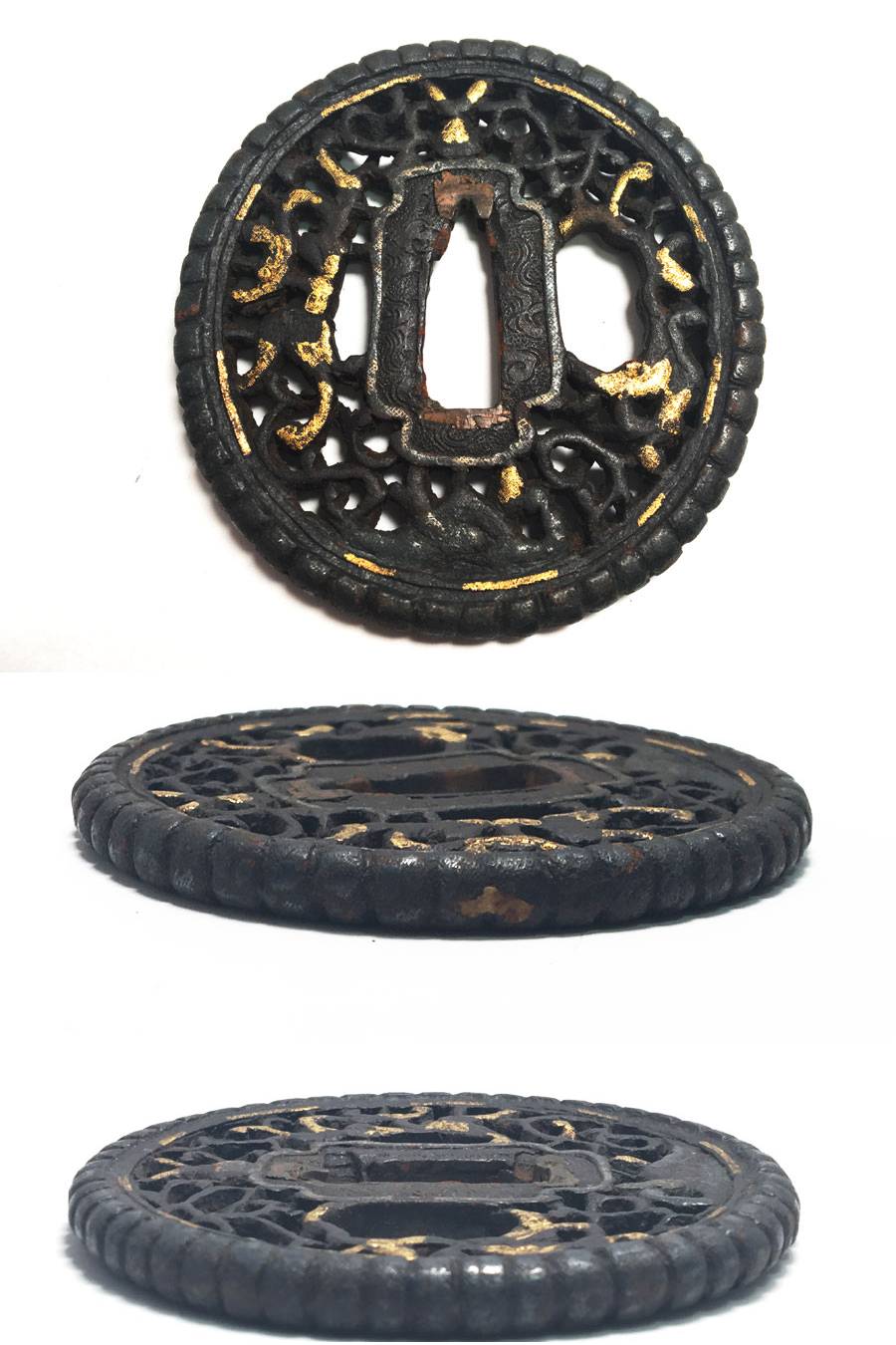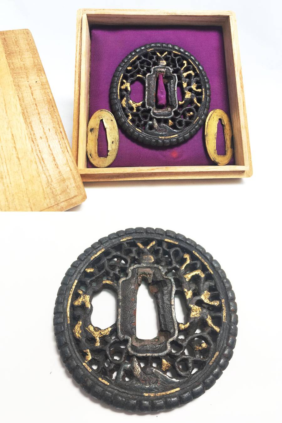 鍔 鉄地丸形南蛮鍔 唐草柄 透かし彫り (重さ約113.6g)切羽 (重さ約10.2g)・桐箱付 金 象嵌 蔵出 日本刀 刀剣 時代武具 アンティーク 骨董 收藏