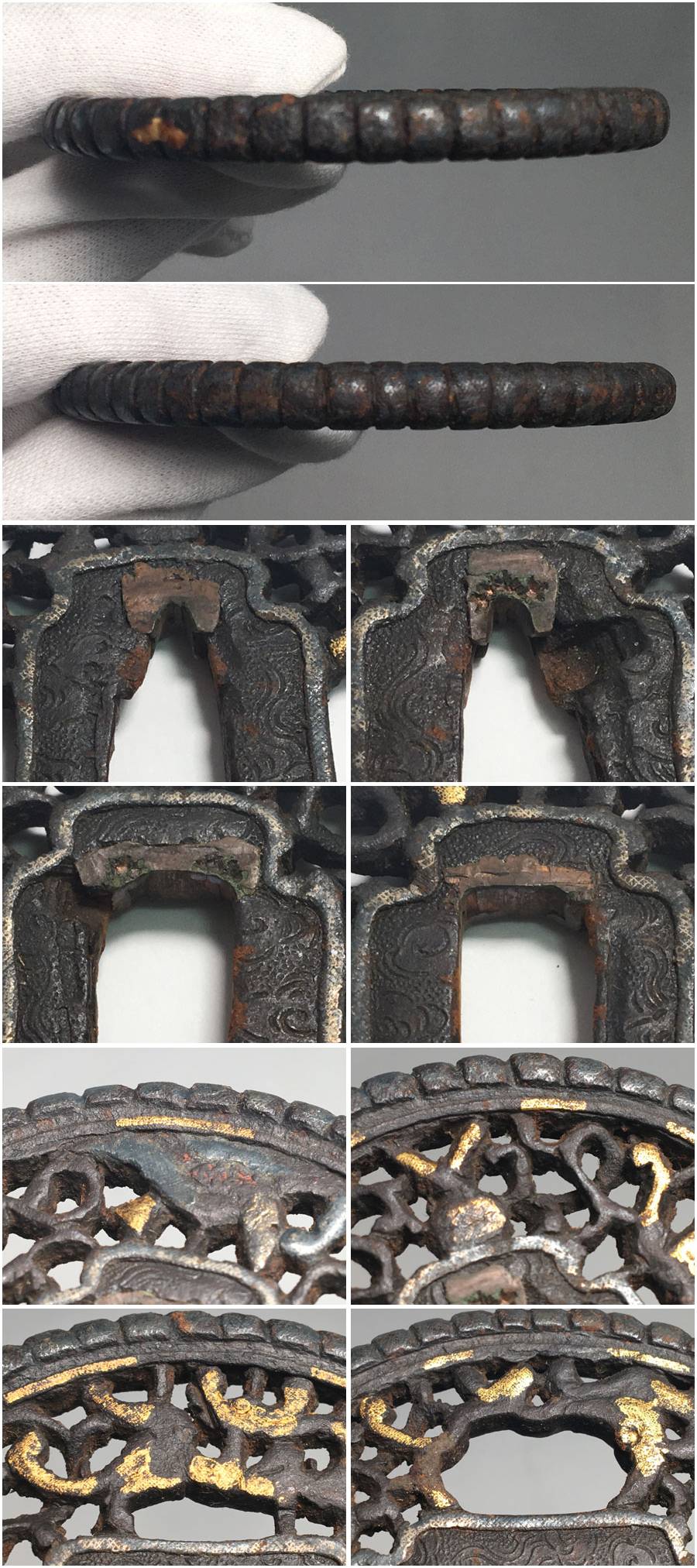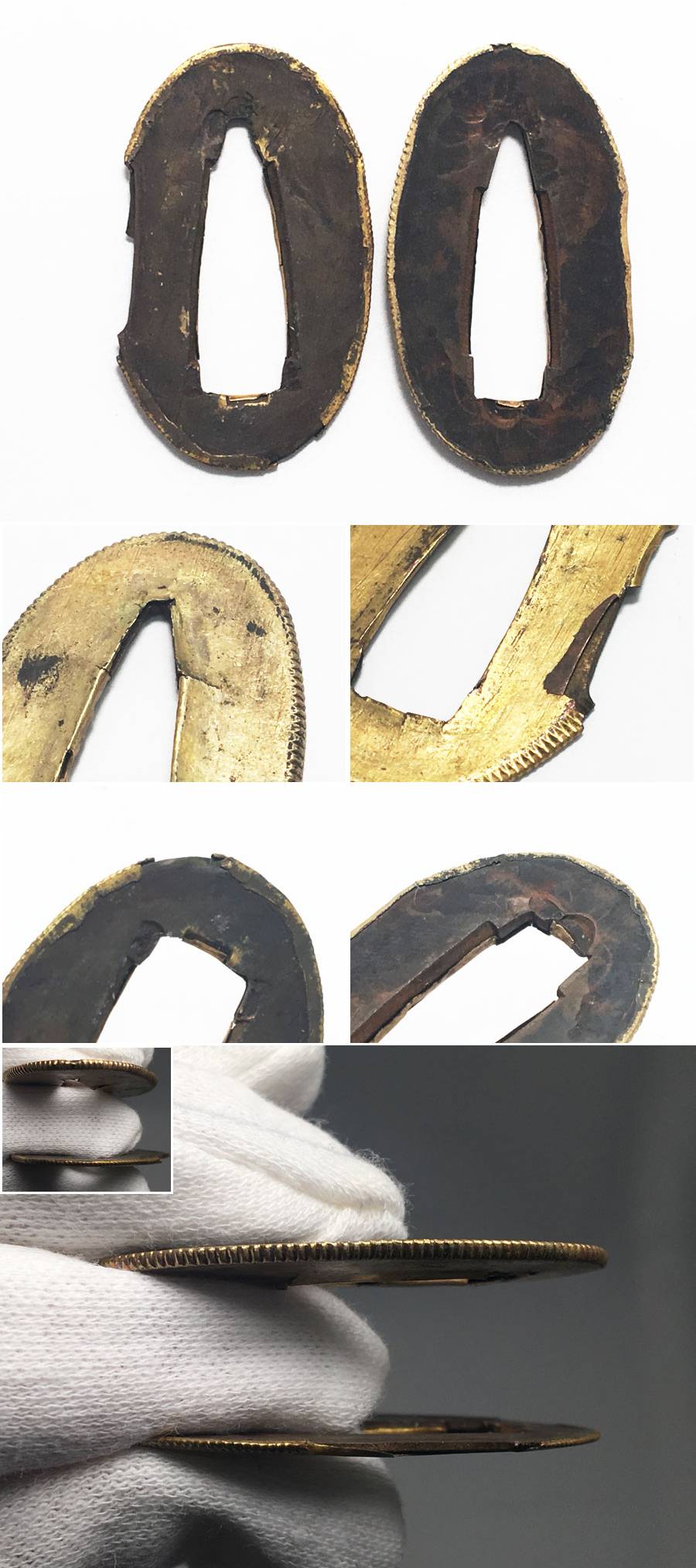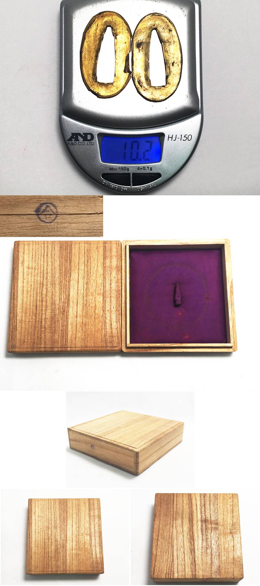鍔 鉄地丸形南蛮鍔 唐草柄 透かし彫り (重さ約113.6g)切羽 (重さ約10.2g)・桐箱付 金 象嵌 蔵出 日本刀 刀剣 時代武具 アンティーク 骨董 收藏
